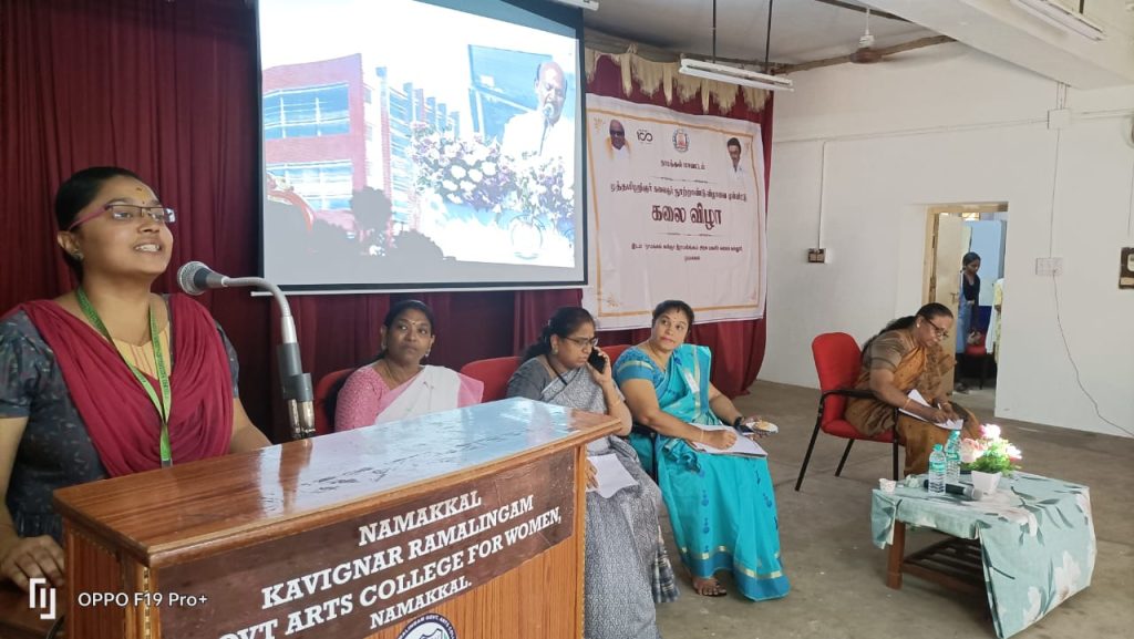 On the occasion of the 100th birth anniversary (centenary birth day celebrations) of Dr. Kalaignar M. Karunanithi (former Chief Minister of Tamil Nadu), the department of Tamil Development, Namakkal, conducted an elocution competition titled “Kalaignar Thoughts in Social Justice” (கலைஞரின் சமூக நீதி கருத்துகள்) on January 11, 2024, in the premises of Namakkal Kavignar Ramalingam Government Arts College for Women, Namakkal. On this subject, Ms. S.P. Sri Sakthi Samaya Sankari, second year B.A., English, has procured the first prize, and she got a Rs. 10000/- (ten thousand only) check from the chief guests. Dr. R.P. Bhuvaneswari, Associate Professor and Head, Department of Economics; Dr. G. Sharmila Banu, Associate Professor and Head, Department of Zoology; and the senior faculty members of Namakkal Kavignar Ramalingam Government Arts College for Women, Namakkal, were the judges of that event. Dr. T. Geetha, Assistant Professor in Tamil at Trinity College for Women, Namakkal, was the caretaker.