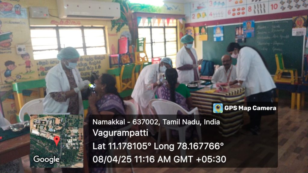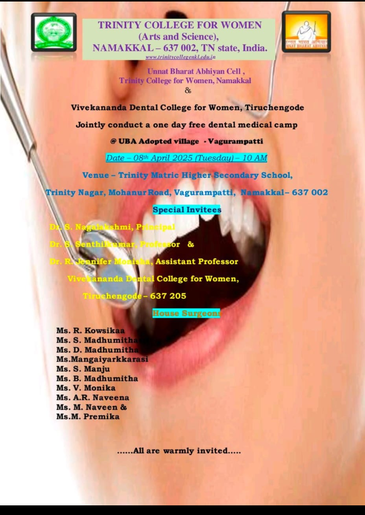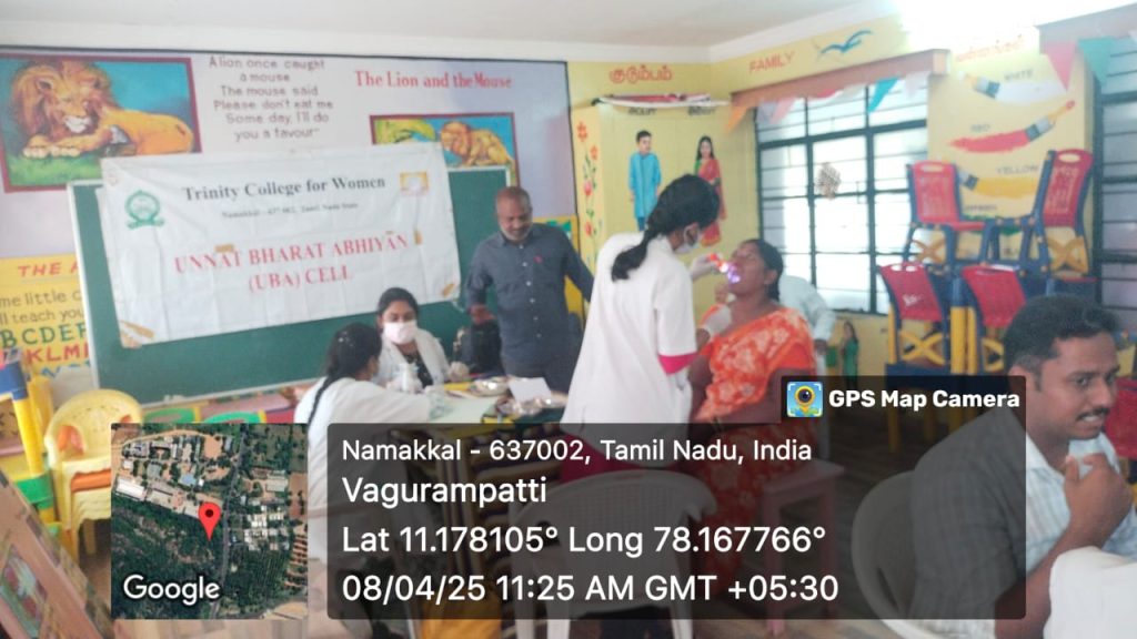 Under the auspices of Unnat Bharat Abhiyan Cell, Trinity College for Women, Namakkal organized a “Free Dental Checkup and Awareness Camp” on 08th April 2025. It was held on the premises of Trinity Academy Matric Higher Secondary School, Trinity Nagar, Mohanur Road, Vagurampatti, Namakkal. The main objective of the dental camp is to create oral health awareness and other facilities for a dental check-up to identify and resolve oral health issues.