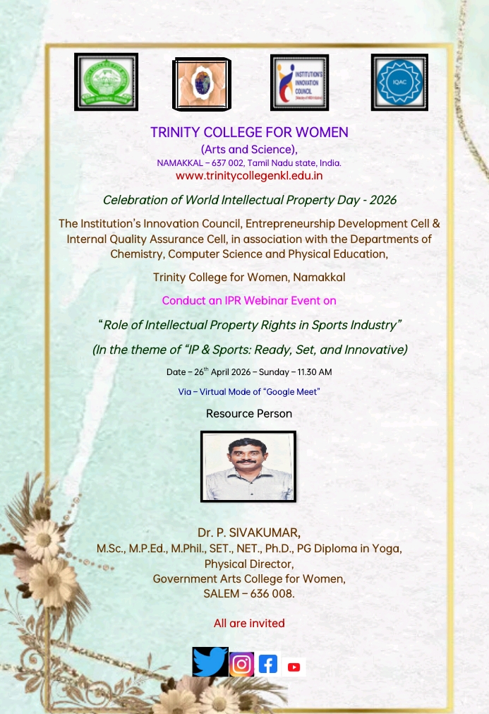 The Institution's Innovation Council, Entrepreneurship Development Cell, and Internal Quality Assurance Cell, in support of the Department of Chemistry, Computer Science and Physical Education, Trinity College for Women, Namakkal, are going to conduct a one-day online webinar on " Role of Intellectual Property Rights in Sports Industry" on April 26, 2026, at 11.30 AM.