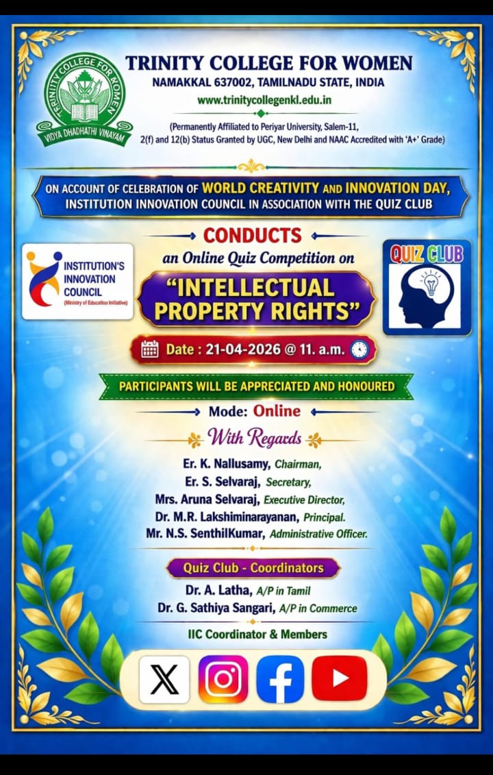 Programme on “IPR”The Institution's Innovation Council, Entrepreneurship Development Cell, and Internal Quality Assurance Cell, in support of the Post Graduate and Research Department of Commerce, Trinity College for Women, Namakkal, are going to conduct a one-day online workshop on "Protecting Intellectual Property Rights (IPRs) and IP Management for Start-ups" on April 28, 2026, at 11 AM.