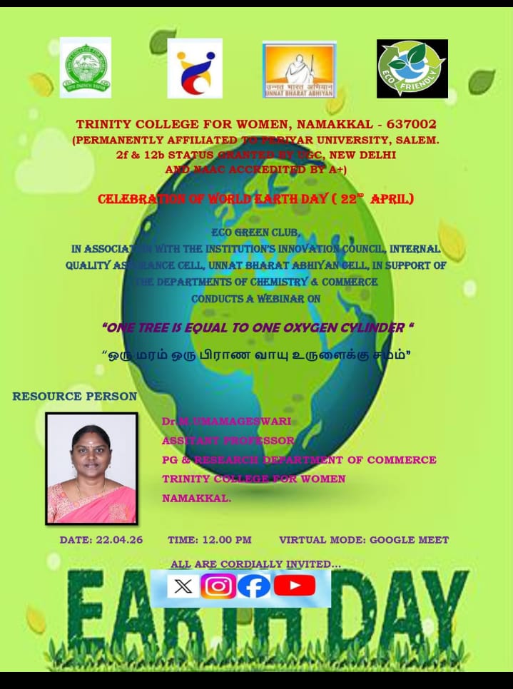 The Institution's Innovation Council, Internal Quality Assurance Cell and Unnat Bharat Abhiyan Cell, in support of the Department of Chemistry and Commerce, Trinity College for Women, Namakkal, are going to conduct a Webinar on " One Tree is equal to one oxygen cylinder'" on April 22, 2026, at 12.00 PM.