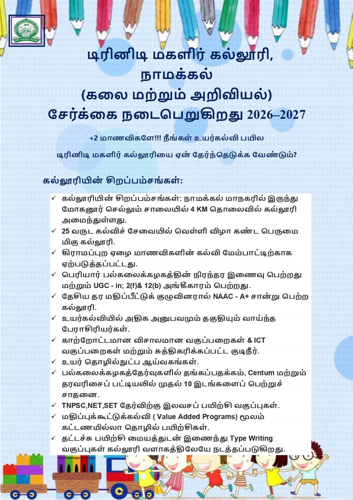 Trinity College for Women (Arts and Science) is situated in Namakkal to Mohanur State highway (SH-95). The college is so accessible that it is just 4 Kms away from Namakkal City. This College is permanently affiliated to Periyar University, Salem-636 011, Tamil Nadu state, India and is recognized with 2f & 12b status from the University Grants Commission, New Delhi. Our College is accredited by NAAC (National Assessment & Accreditation Council) with A+ Grade (3.31 CGPA – Cumulative Grade Point Average, out of 4.0). It was started in the year 2000 by Trinity Academy Charitable Trust with the aim of imparting higher education to women in general and women belonging to economically weaker sections of the society in and around Namakkal. Knowledge is power is the soul motto of our college.
