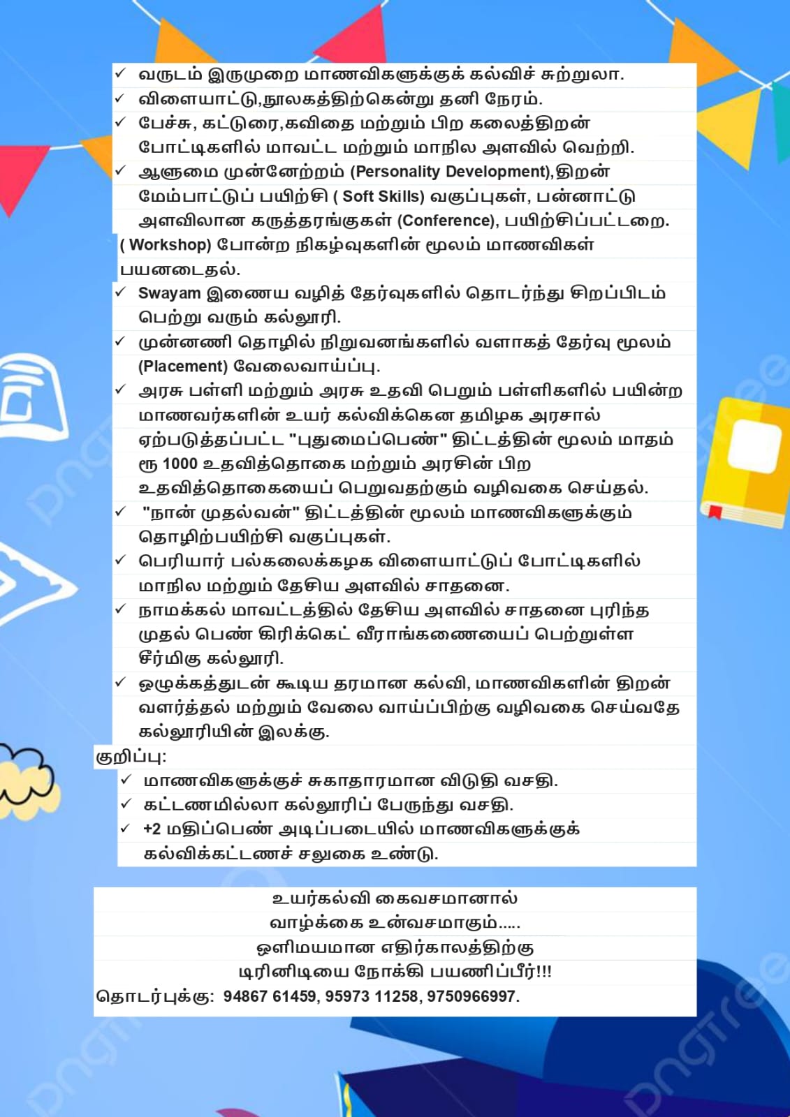 Namakkal – Trinity College for Women has not been merely a college for me to study, but served me as a second home where I nurtured myself to the core. This is one of the places which helped me to reach my heights, including my numerous victories in quiz competitions and declamation contests where I got the opportunities to get awards and rewards from various political and permanent executives, including “The Honorable Chief Minister of Tamil Nadu” Thiru M.K. Stalin in the year 2022. Now, with the blessings of the Almighty's, Parents and Teachers, I have been working as Junior Assistant Manager at one of the renowned scheduled banks since the year 2025. I convey my special gratitude to our Trinity College.