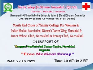 The Youth Red Cross of Trinity College for Women- Namakkal, Rotary Club- Namakkal, Namakkal Indian Medical Association- Women Doctor’s Wing, Inner Wheel Club- Namakkal and Thangam Hospitals and Cancer Centre, Namakkal jointly organized “Free Medical Camp” on 27.10.2022 in the College campus.