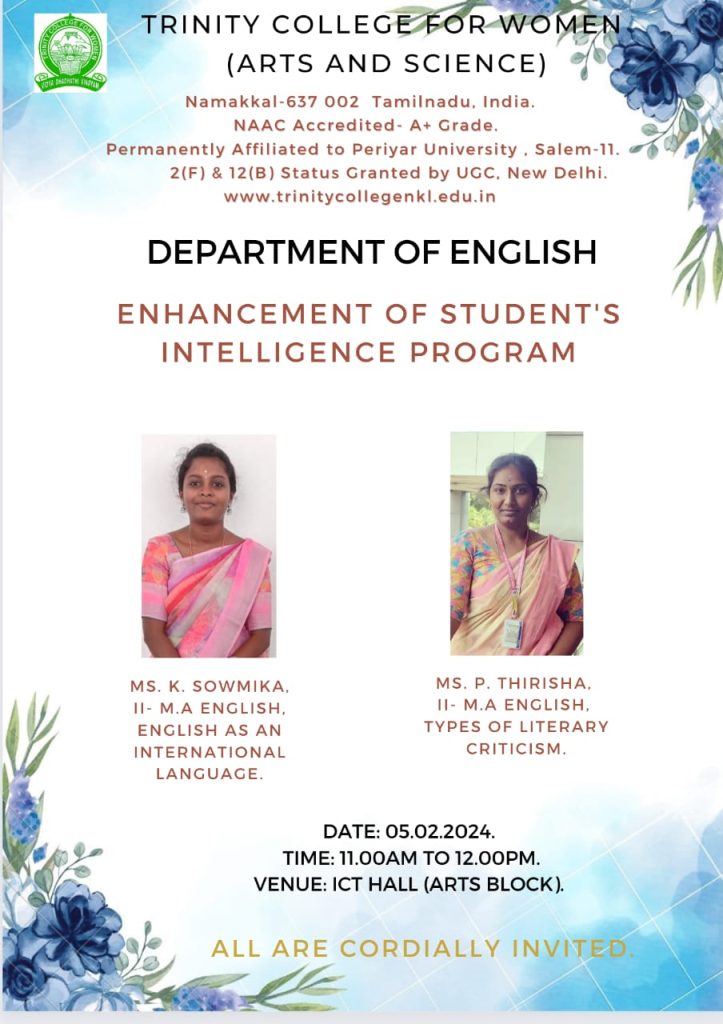 | 02 | 05.02.2024 | English | Types of Literary Criticism | Ms. P. Thirisha,II M.A., EnglishTrinity College for Women, Namakkal |
