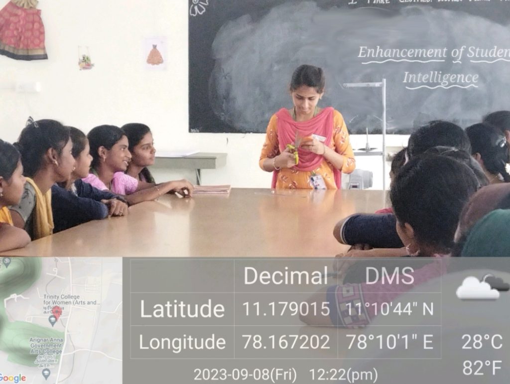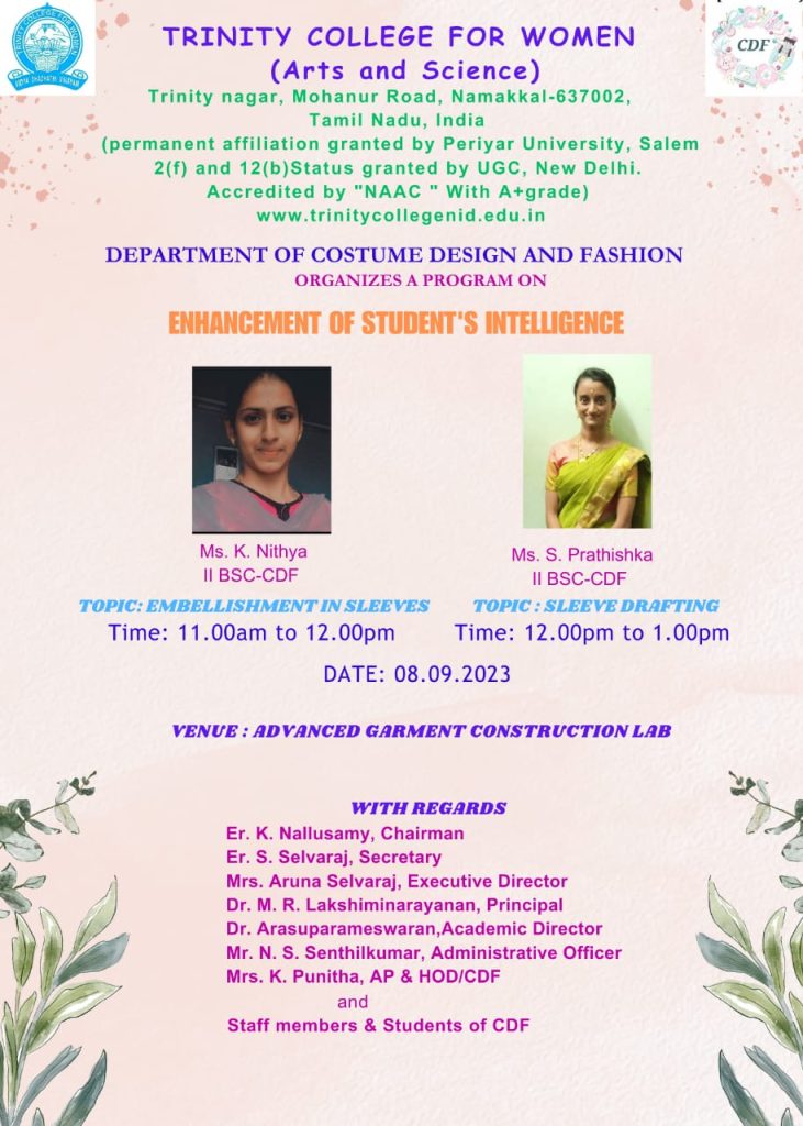 | 01 | 08.09.2023 | Costume Design and Fashion | Embellishment in sleeves | Ms. K. Nithya,II B.Sc., CDFTrinity College for Women, Namakkal |