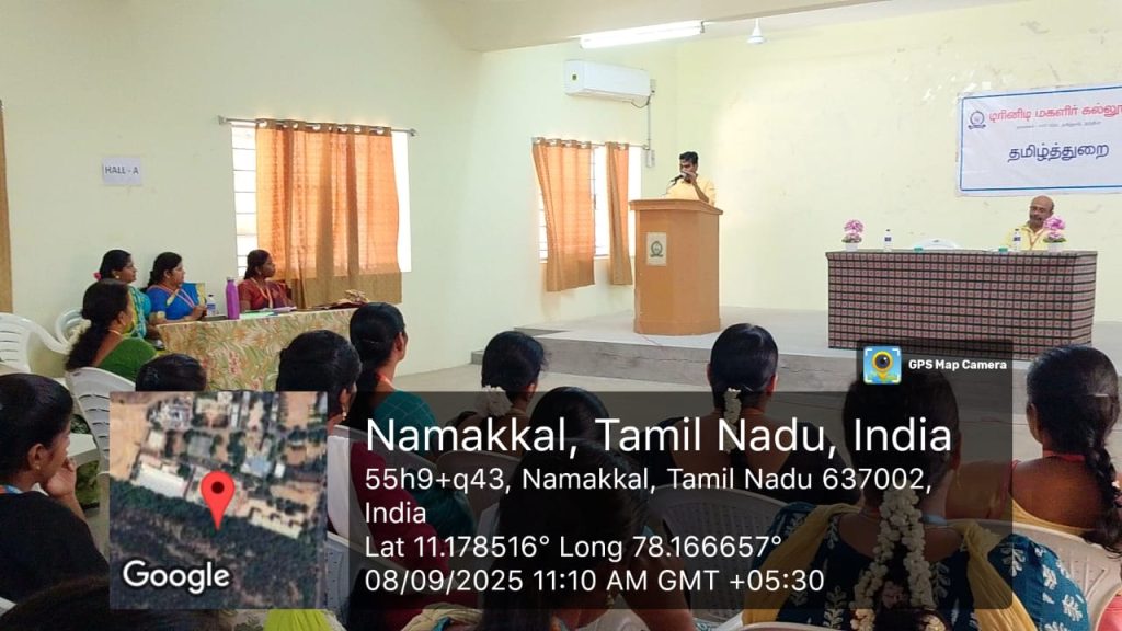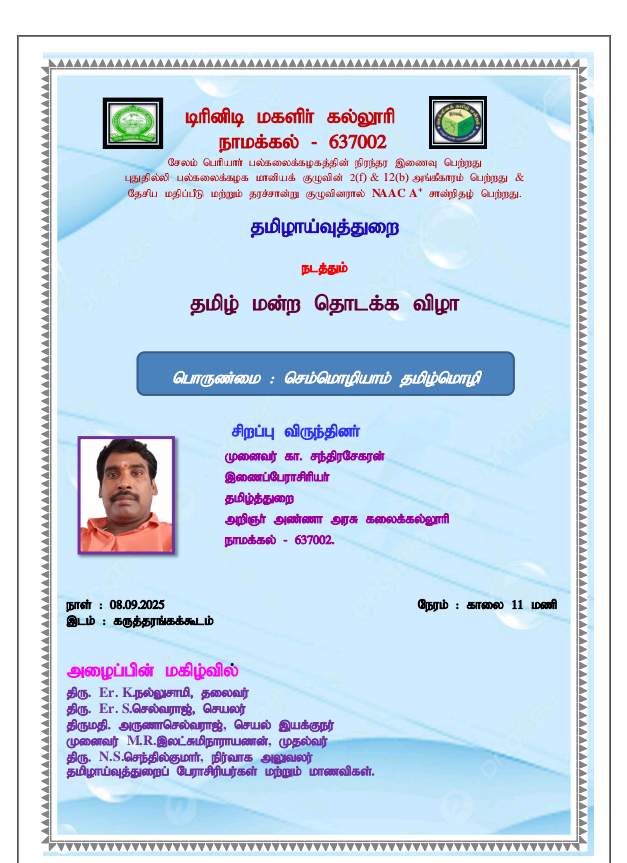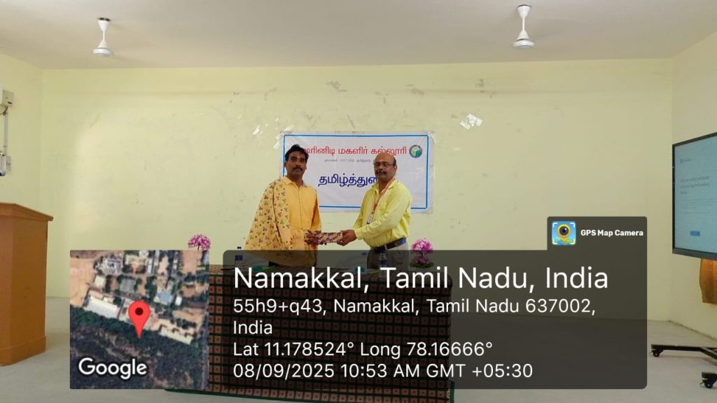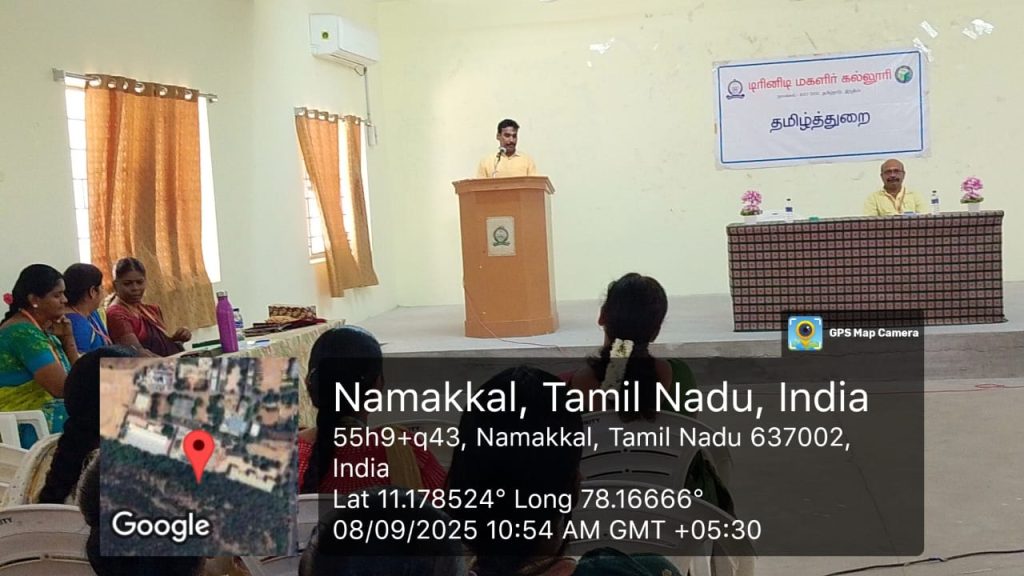 Under the auspices of the Department of Tamil, Trinity College for Women, Namakkal inaugurated the Tamil Literary Association (தமிழ் மன்ற துவக்க விழா) on 08th September 2025 (Wednesday) @ 11 AM at the college campus. Dr. M.R. Lakshiminarayanan, Principal of the College welcomed the gathering.