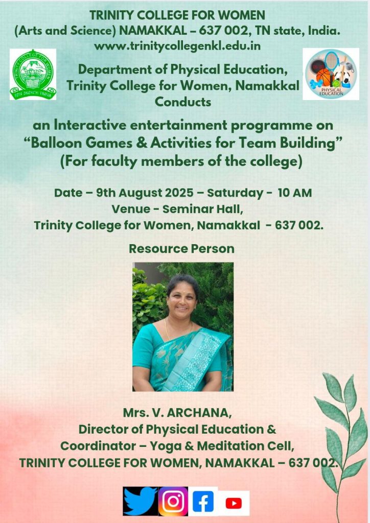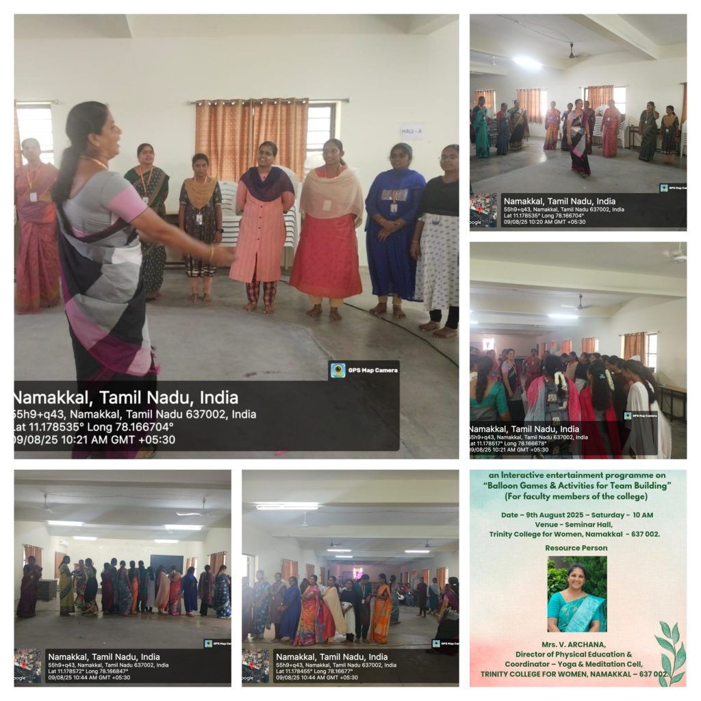 The Department of Physical Education, Trinity College for Women, Namakkal conducted “An Interactive Entertainment Programme – Balloon Games and Activities for Team Building” (for faculty members of the College) on 09.08.2025.