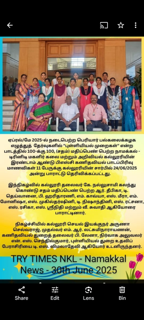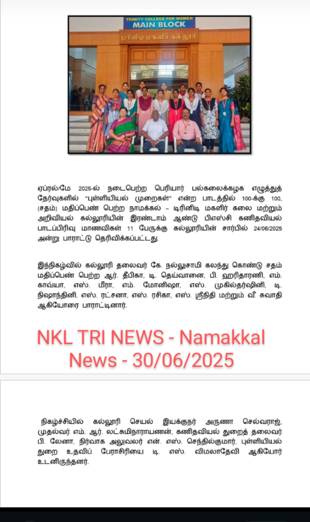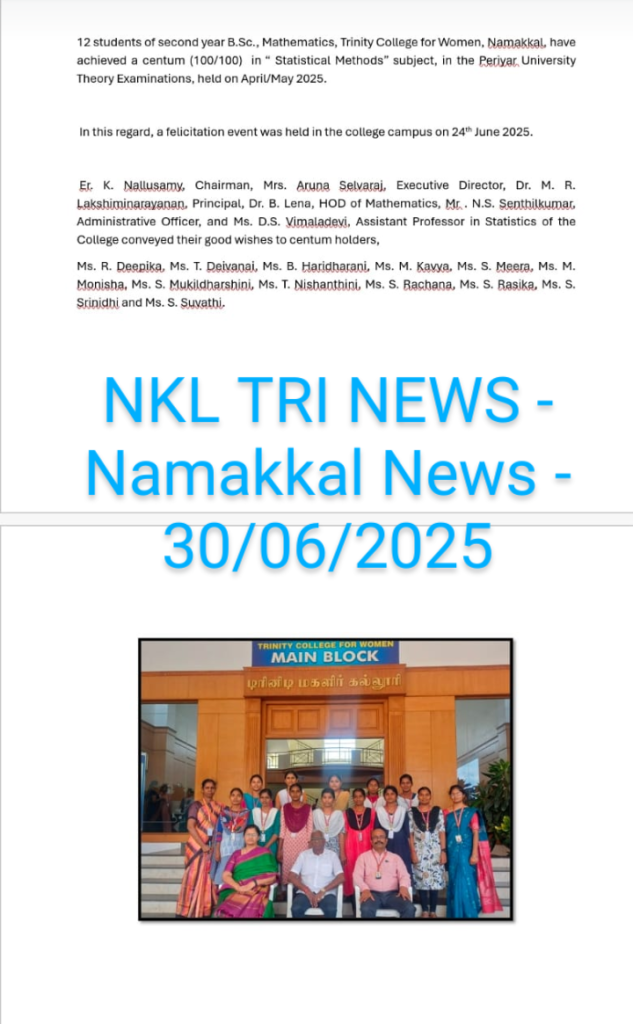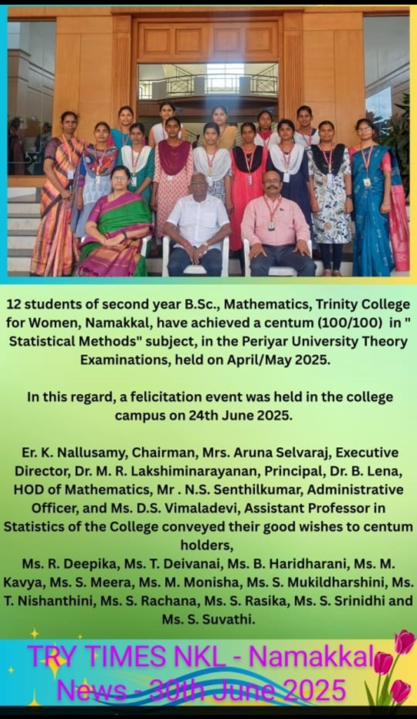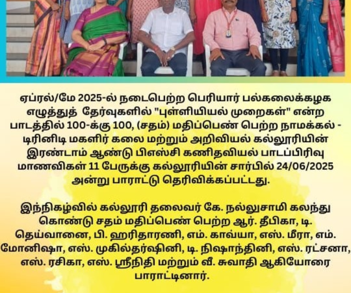 The above said centum holders as well as Ms. D.S. Vimaladevi, Assistant Professor in Statistics, Trinity College for Women, Namakkal are congratulated by the Chairman Er. K. Nallusamy, The Executive Director, Mrs. Aruna Selvaraj, The Principal, Dr. M.R. Lakshiminarayanan, Principal, The Administrative Officer, Mr. N. S. Senthilkumar, Dr. B. Lena, Assistant Professor and Head, Department of Mathematics and the faculty members of Mathematics.