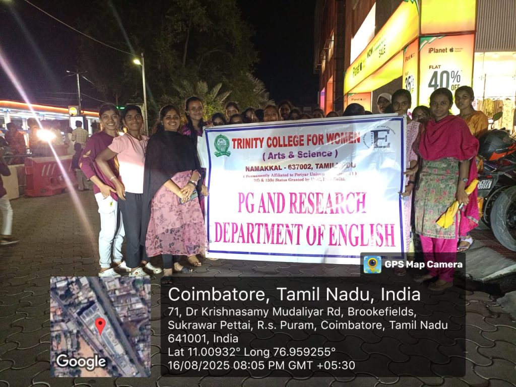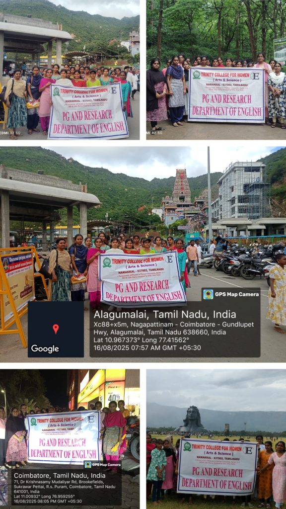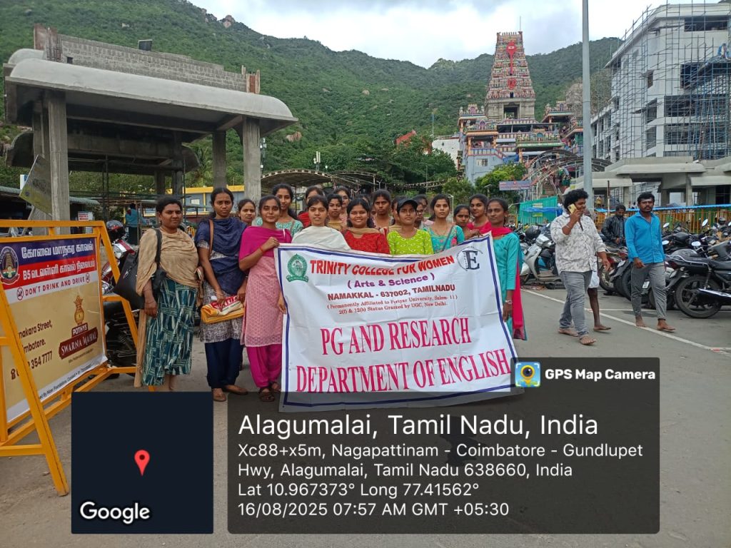 Field visits for college students are great opportunities for observational learning on the outside of the class rooms.  On this subject, four faculty members of English   (Mrs. P. Abirami, Dr. K. Gowrimala, Ms. S. Kavya and Ms. M.V. Mekavarshini) along with 34 students of B.A., and M.A., English, Trinity College for Women, Namakkal,  went to Coimbatore on 16.08.2025 for a field visit.