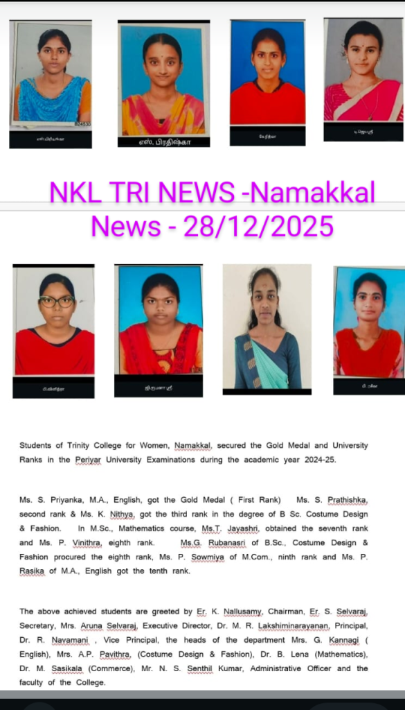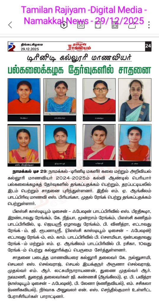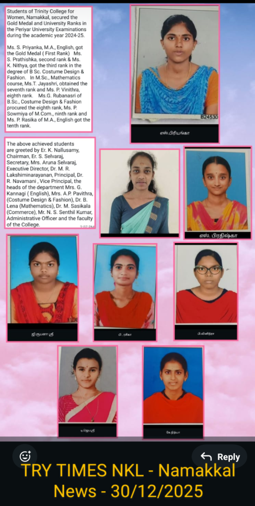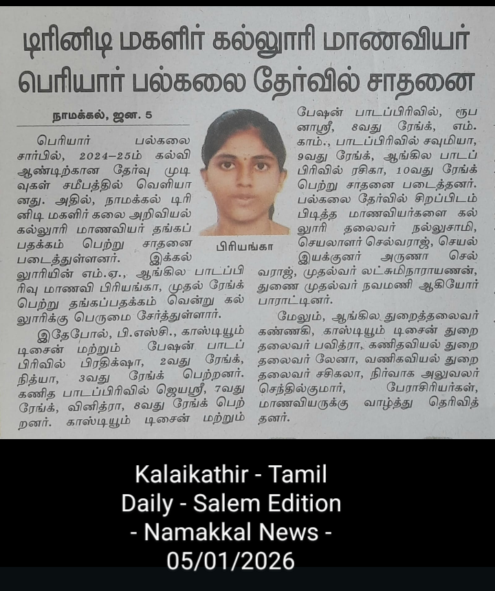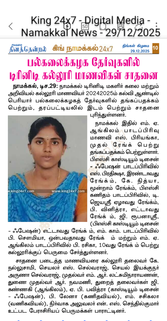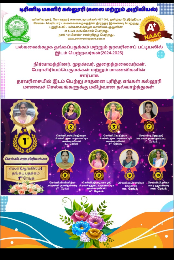 We are pleased to inform, Periyar University, Salem has recently published the rank holders list for the academic year 2024-2025. Our students of Trinity College for Women, Namakkal, secured 8 ranks in the Periyar University Examinations.