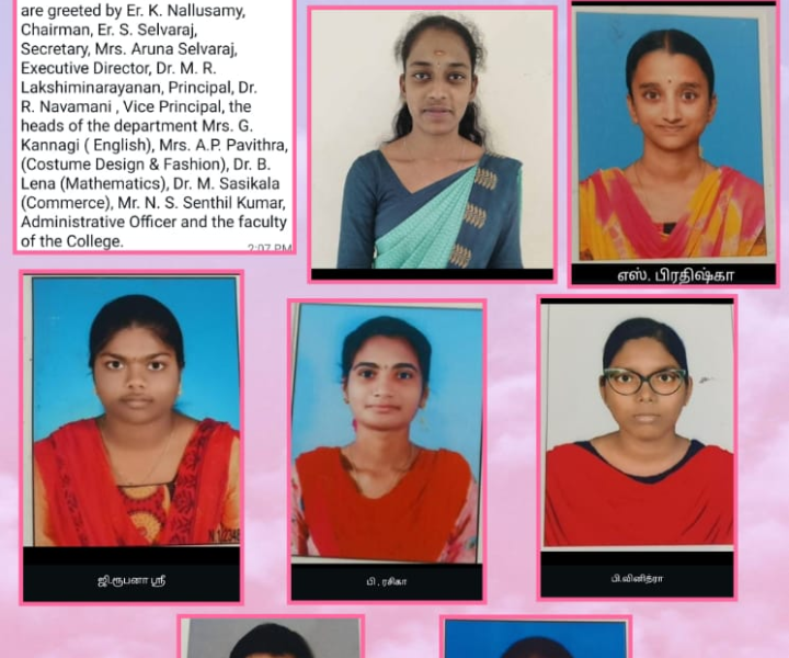 The above-said achievers are greeted by Er. K. Nallusamy, Chairman, Er. S. Selvaraj, Secretary, Mrs. Aruna Selvaraj, Executive Director, Dr. M.R. Lakshiminarayanan, Principal, Dr. R. Navamani, Vice-Principal, Dr. M. Sasikala, HOD of Commerce, Dr. B. Lena, HOD of Mathematics, Mrs. G. Kannagi, HOD of English, Mrs. A.P. Pavithra, HOD of Costume Design and Fashion, Mr. N.S. Senthilkumar, Administrative Officer and the faculty members of the College.