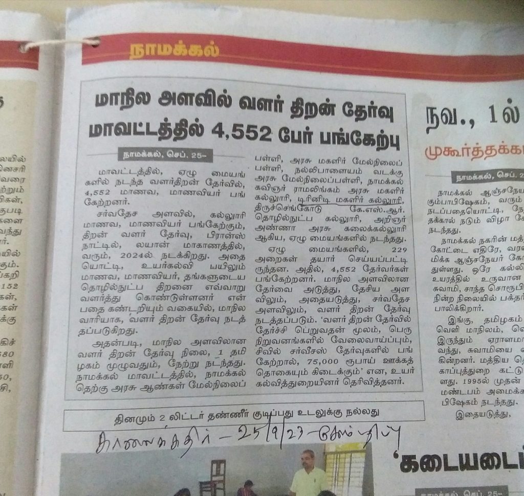 As an element of the Naan Mudhalvan Scheme of the Government of Tamil Nadu, the Tamil Nadu Skills Competition Level, a one-hour OMR examination held in Namakkal on September 24, 2023. This examination was held in the centres, namely Trinity College for Women, Namakkal, KSR College of Technology, Tiruchengode, Arignar Anna Government Arts College, Namakkal, Government Girls Higher Secondary School, Namakkal, Government Boys Higher Secondary School, Mohanur Road, Namakkal South, and Government Higher Secondary School, Nallipalayam, Namakkal North.