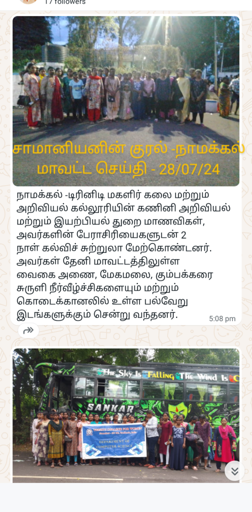 Industrial visits are a necessity for undergraduates and postgraduates who are studying at higher educational institutions. In this regard, 67 students (B.Sc., Computer Science, BCA, and B.Sc., Computer Science., Artificial Intelligence, and Data Science) along with 6 faculty members (Mrs. S. Bhuvaneswari, Dr. S. Usharani, Mrs. M. Malathi, Dr. K. Vijayakumari, Mrs. V. Abirami, and Ms. M. Kiruthika) of Trinity College for Women, Namakkal, went to Kodaikanal, Dindigul District, and Theni District on July 26th and 27th, 2024.