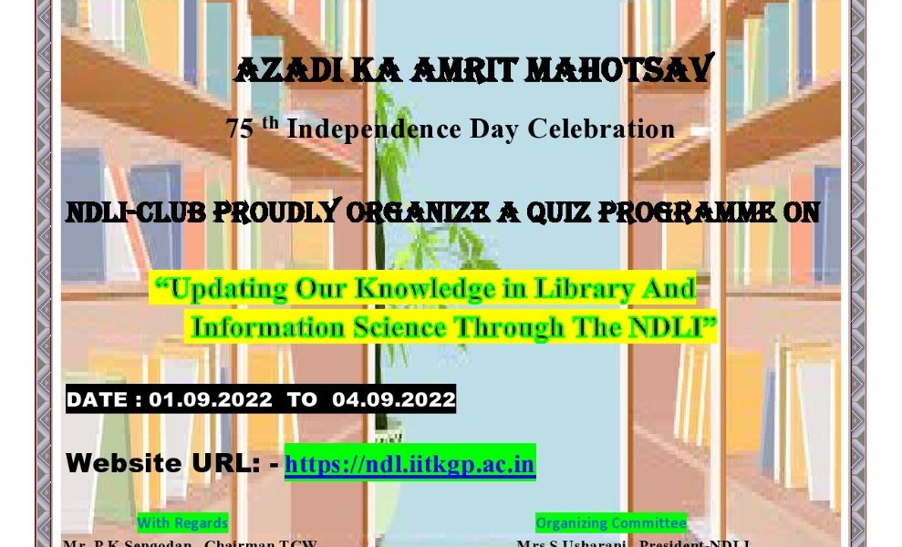 · Owing to Azadi Ka Amrit Mahotsav (75th Independence Day celebrations of India), NDLI club of Trinity College for Women, Namakkal organized a quiz programme entitled “Update knowledge in library and information science through the NDLI” from 01.09.2022 to 04.09.2022.