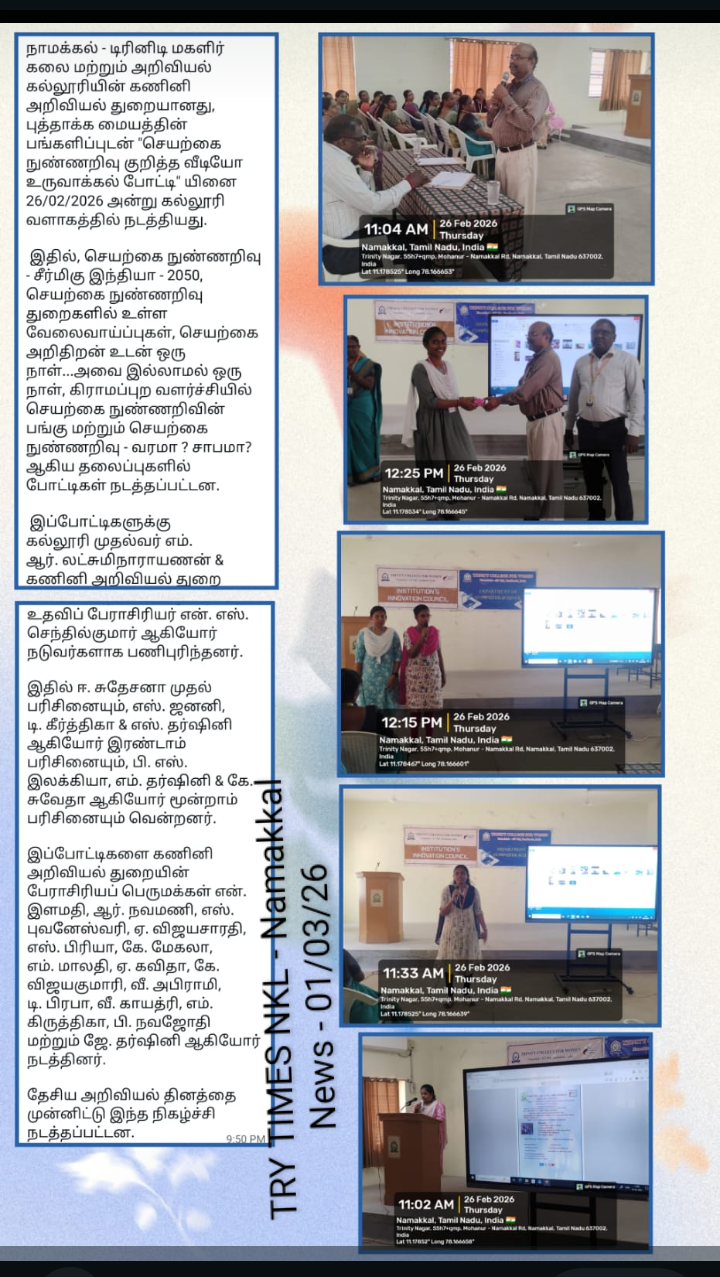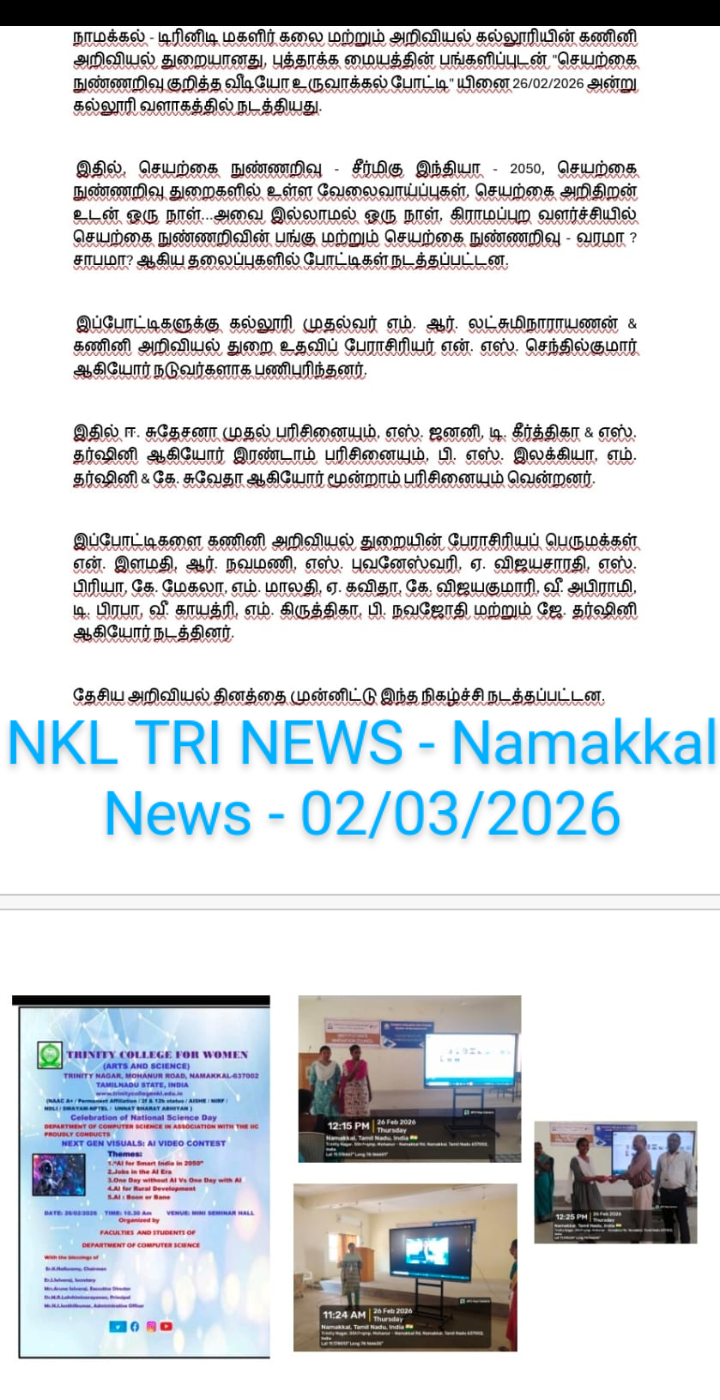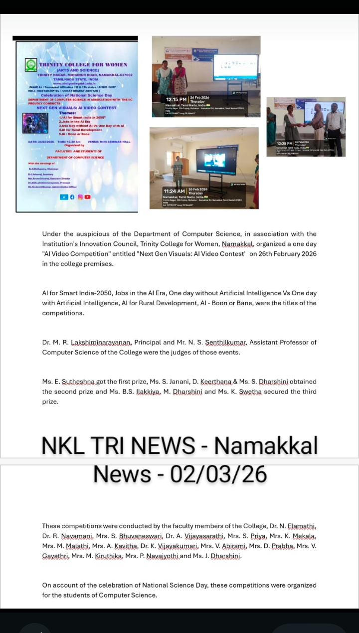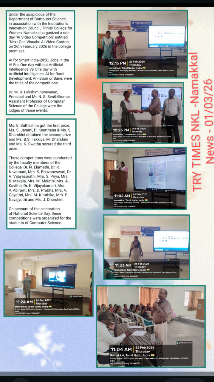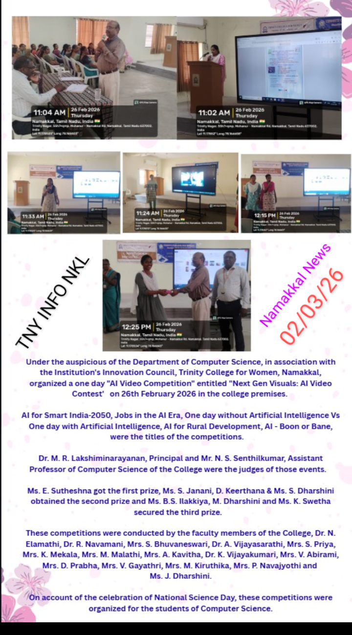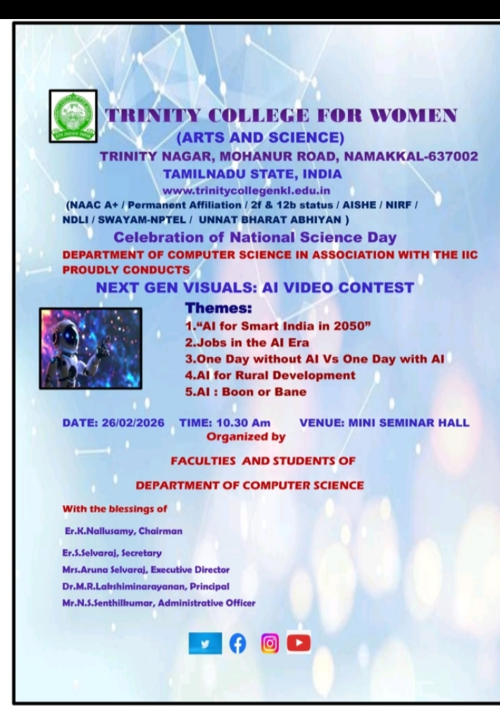 The Department of Computer Science, in association with the Institution’s Innovation Council, Trinity College for Women, Namakkal, organized a programme titled “Next Gen Visuals: AI video Contest” on 26th February 2026 in the College premises.