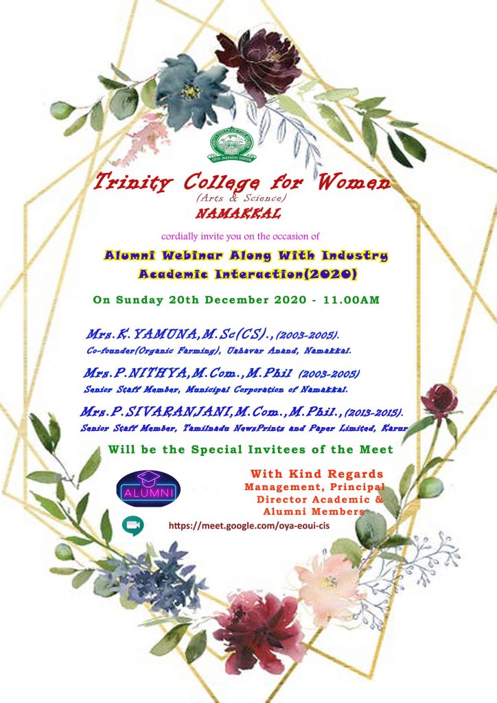 This programme was organized by Alumni Forum of Trinity College for Women, Namakkal.  In this regard, the following Alumni of our College enthusiastically participated in this web based event. The details of Alumni are as follows