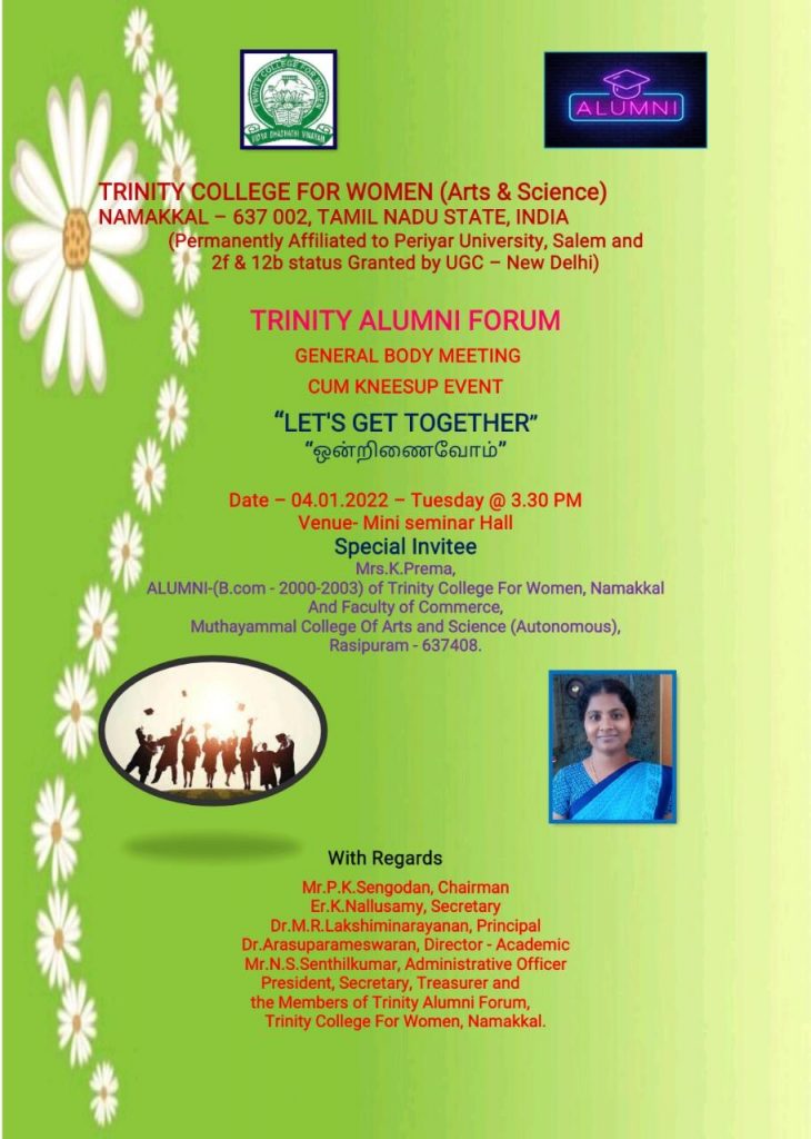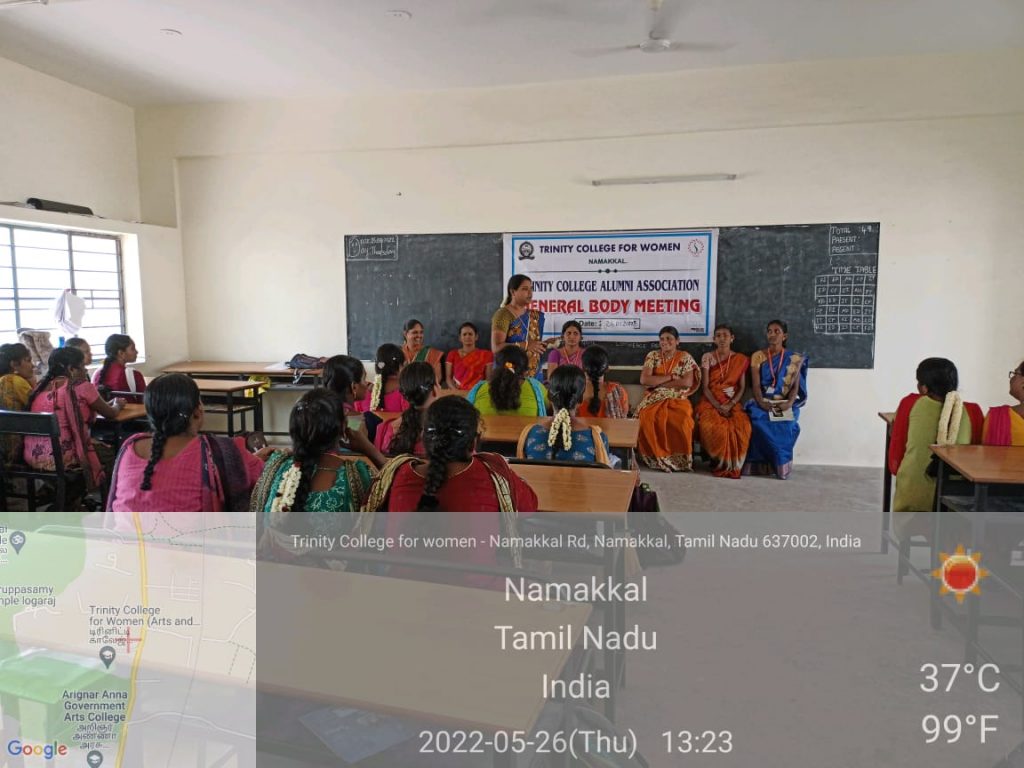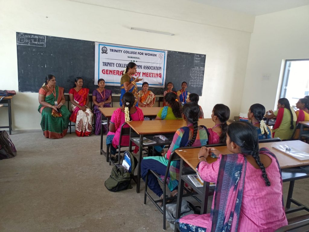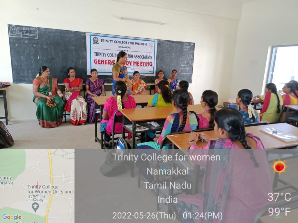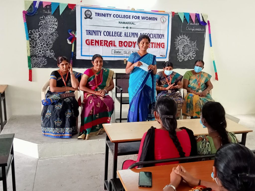 The faculty members and the Alumni of Trinity College for Women –   Mrs. G. Nithya, Mrs. V. Gokila, Mrs. R. Banupriya, Mrs. P. Sathiya, Ms. S. Devi and Ms. K. Saranya took part in that alumni meet.     More than 100 students participated in that Alumni Meet.