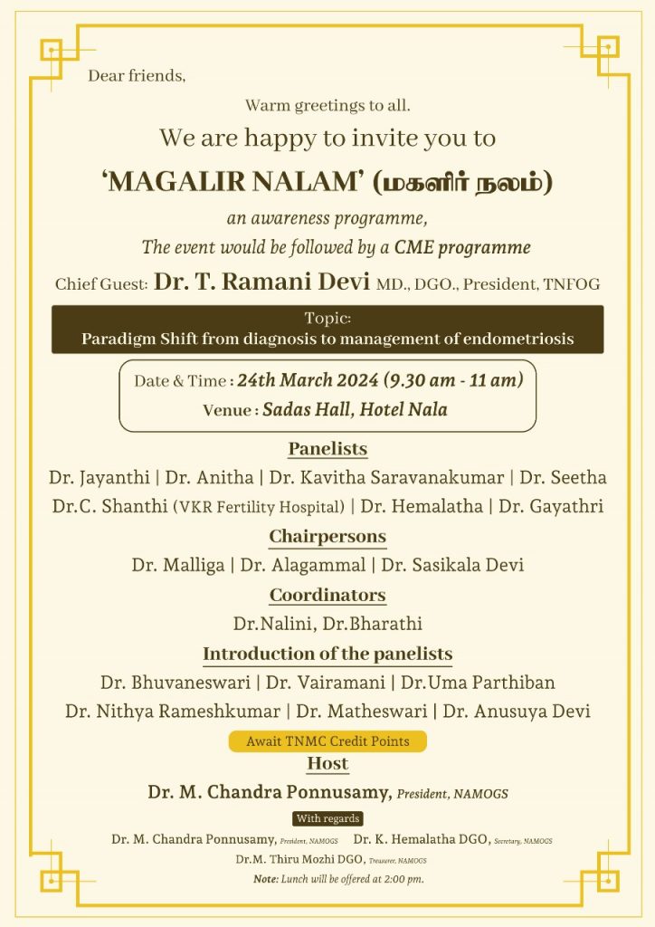 The Executive Director of Trinity College for Women, Namakkal, Mrs. Aruna Selvaraj, The President of Namakkal Obstetrics and Gynaecological Societies, Dr. M. Chandra Ponnusamy, The Secretary Dr. K. Hemalatha and the Treasurer Dr. M. Thirumozhi spoke on that occasion.