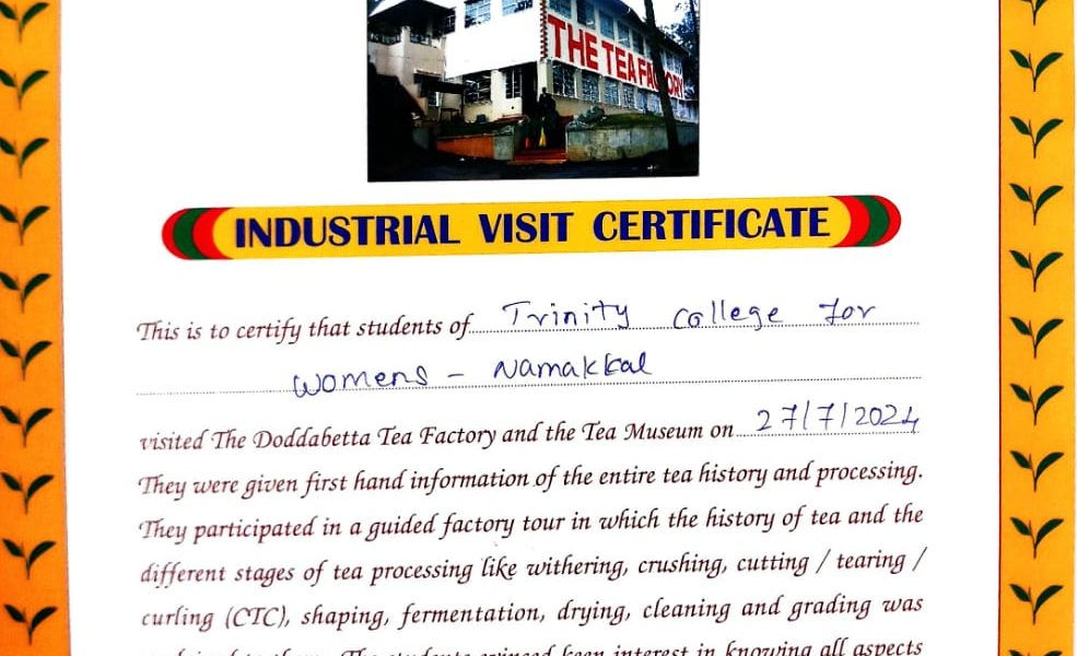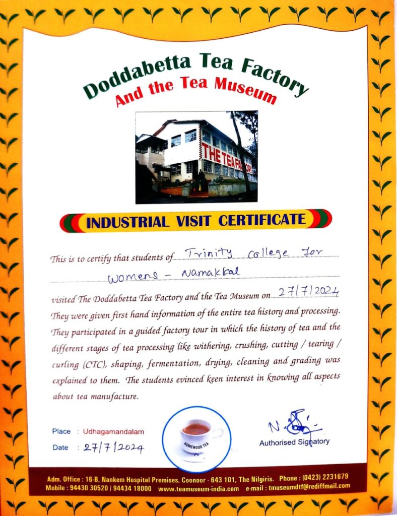Students of Tamil Department, Trinity College for Women, Namakkal went to Ooty on 27th July 2024 for the industrial visit and an educational tour.     In this regard, they visited “Doddabetta Tea Factory and the Tea Museum” on that day.    This firm presented the appreciation certificate to the Tamil students of our institution.   The college conveyed its thanks to the Doddabetta Tea Factory, Ooty.