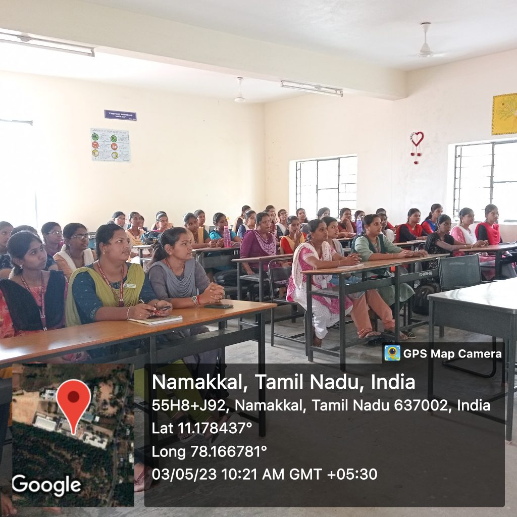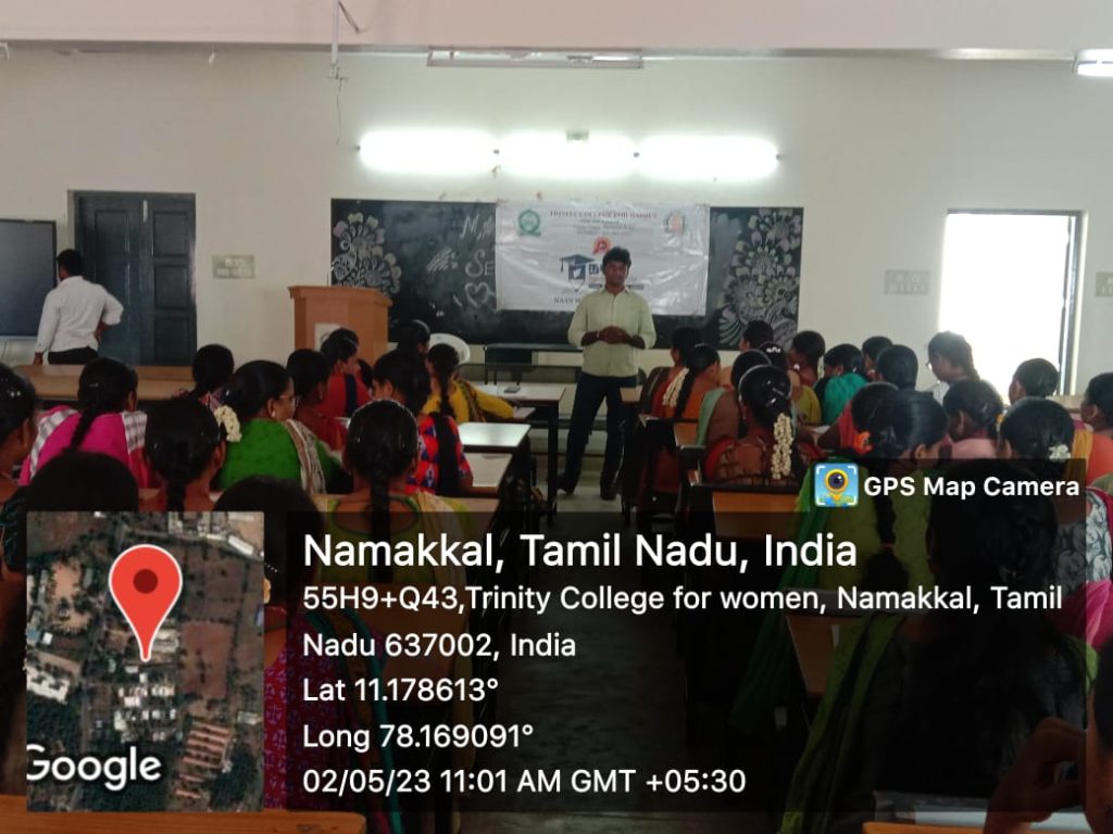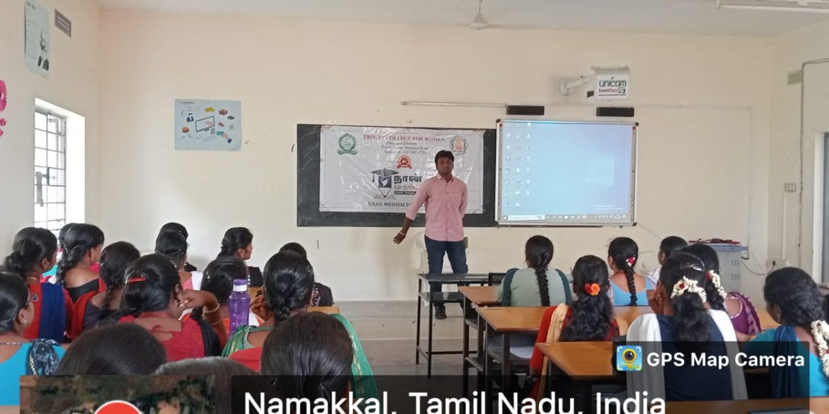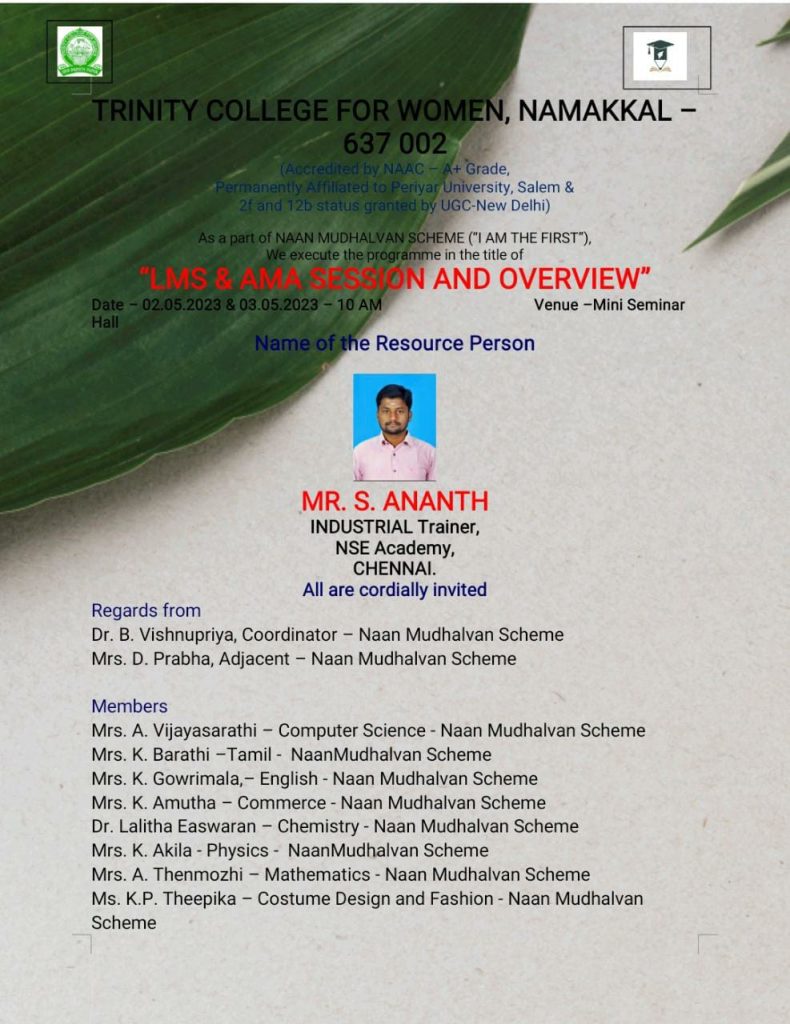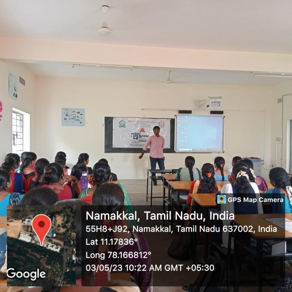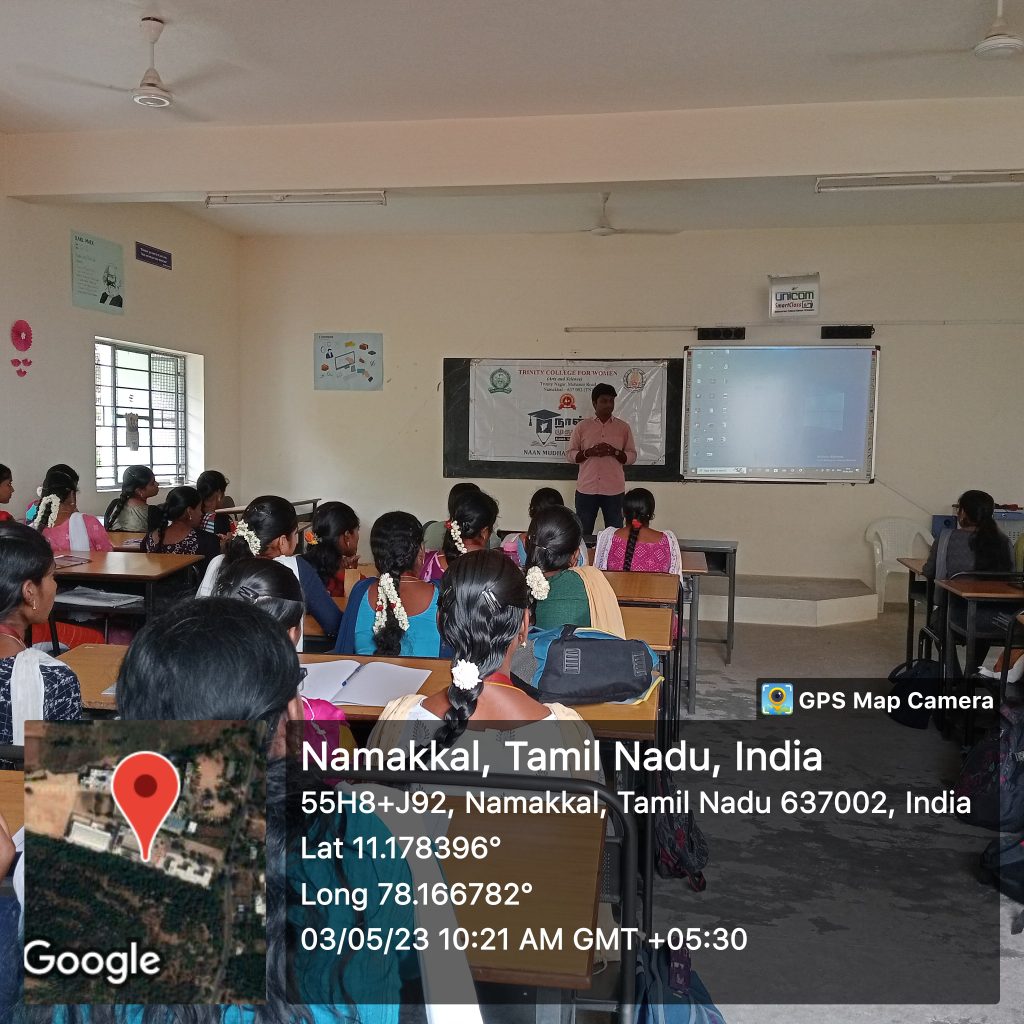 As a component of the Naan Mudhalvan Scheme (I am the first), Trinity College for Women, Namakkal organized a programme under the title of “LMS (Learning Management System) and AMA (Ask me anything) session and overview” was held on 03rd May 2023 in the venue of mini seminar hall of the College.