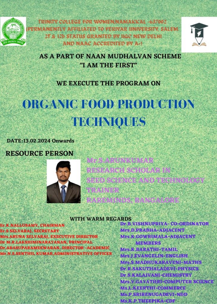 As a part of Naan Mudhalvan, Trinity College for Women, Namakkal conducted a nine week programme titled “Organic Food Production Techniques” on 13th February, 20th February, 27th February, 6th March, 12th March, 19th March and 5th April 2024.