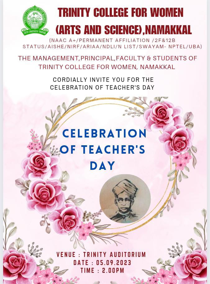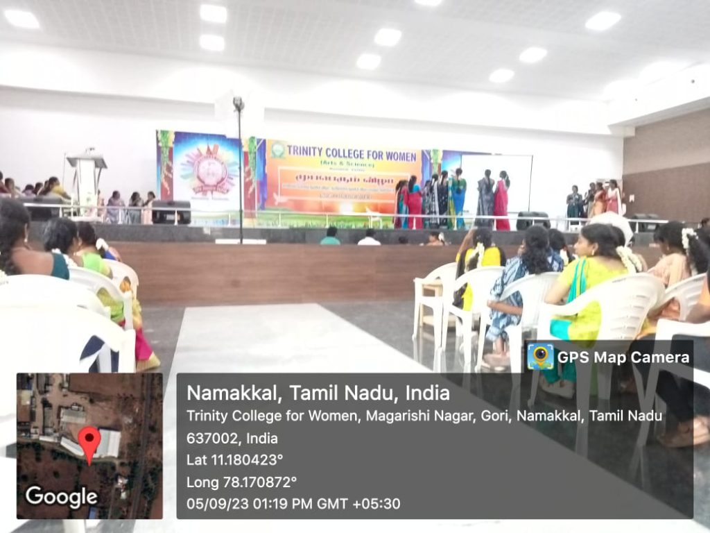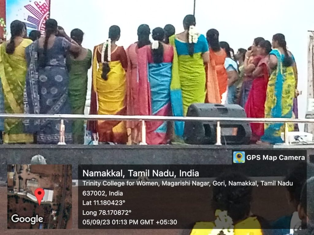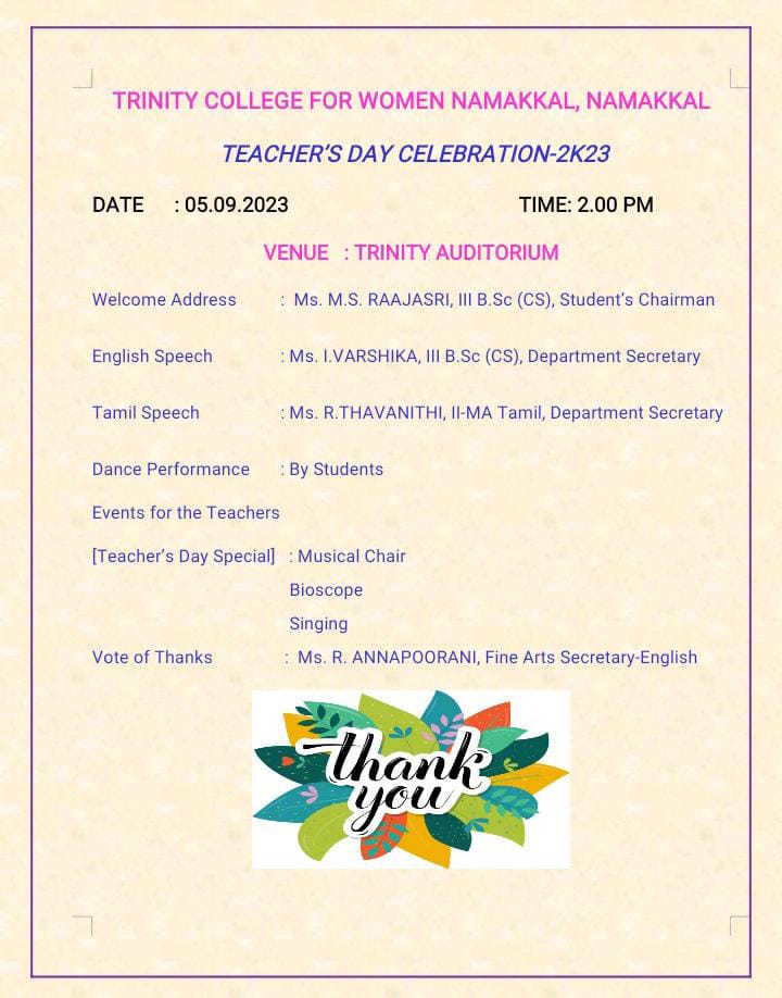 As a part of Teacher’s Day Celebrations, various games were conducted by the students of Trinity College for Women, Namakkal in place of Trinity Auditorium on 05th September 2023. Ms. M.S. Raajasri, third year B.Sc., Computer Science, Student’s Chairman of the College delivered the welcome address. Ms. I. Varshika, third year B.Sc., Computer Science, Department Secretary spoke about the teacher’s day speech, in her talk; she denoted the teacher’s sacrifice from the Pre KG to Ph.D., Ms. R. Thavanithi, second year M.A., Tamil, Department Secretary, highlighted the special of teacher’s day celebrations and she pointed out the role of teachers for the student’s life upliftment. Ms. R. Annapoorani, Fine Arts Secretary, Department of English proposed the vote of thanks.