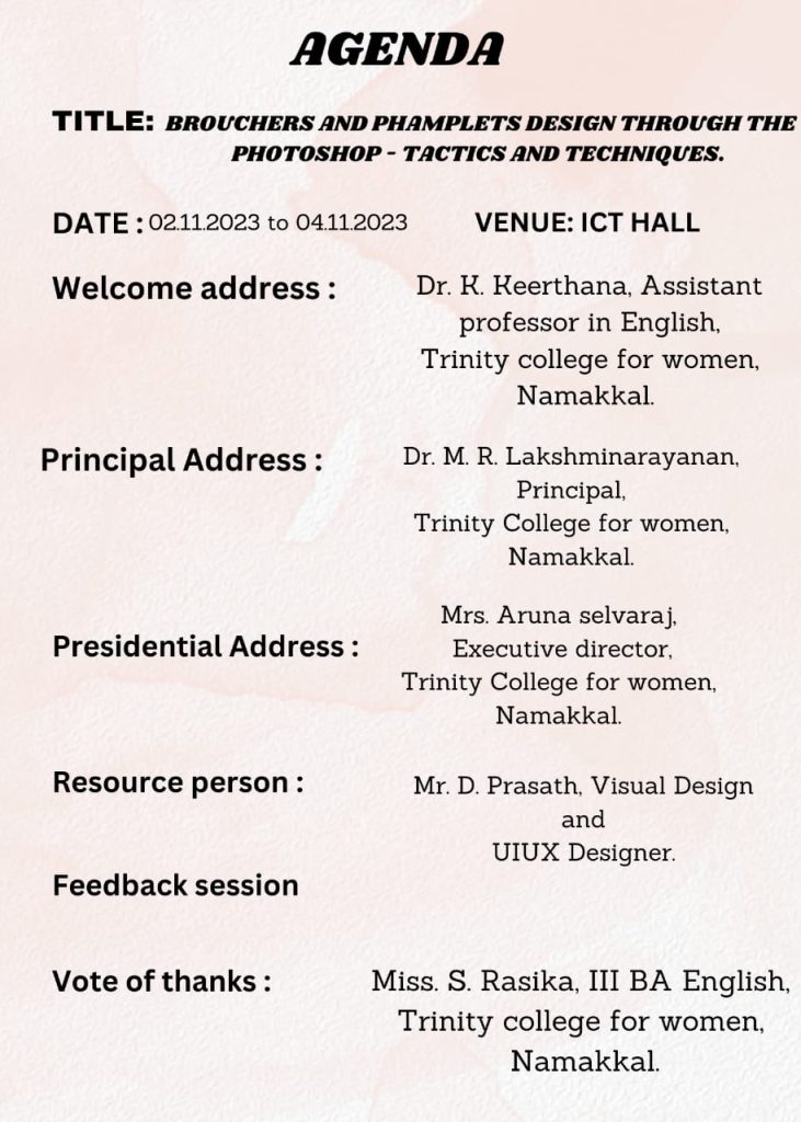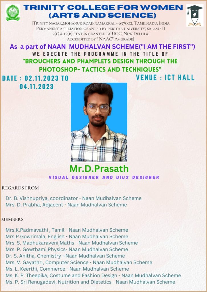 As a part of the Naan Mudhalvan Scheme (I am the first), Trinity College for Women, Namakkal, conducted a 3-day programme entitled ‘Brouchers and pamphlets design through Photoshop: tactics and techniques” from November 2, 2023, to November 4, 2023. It was held through virtual mode.