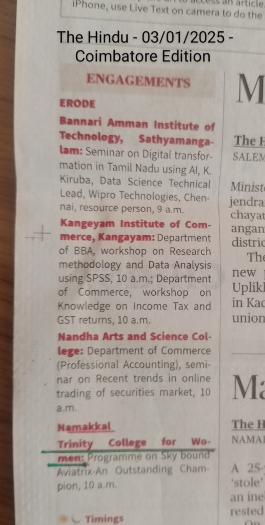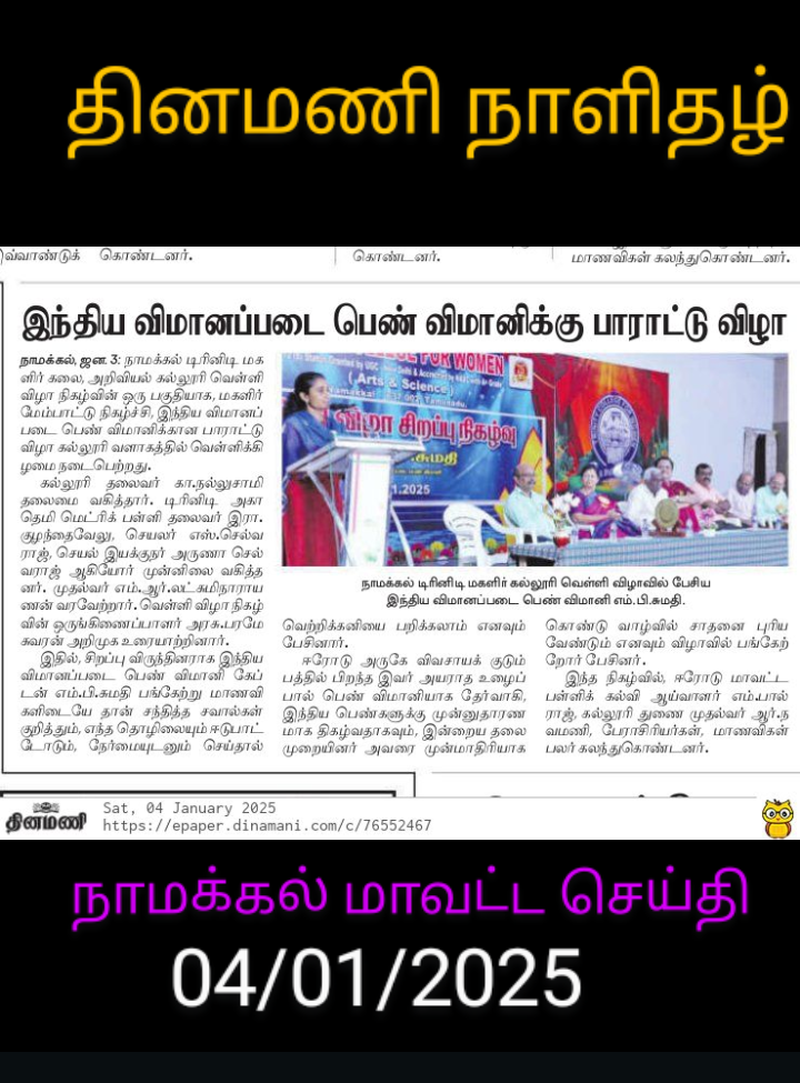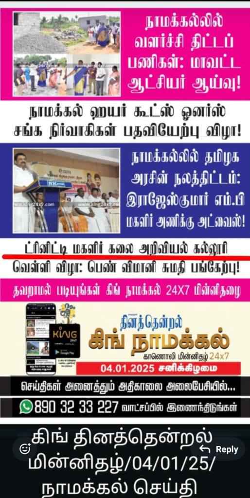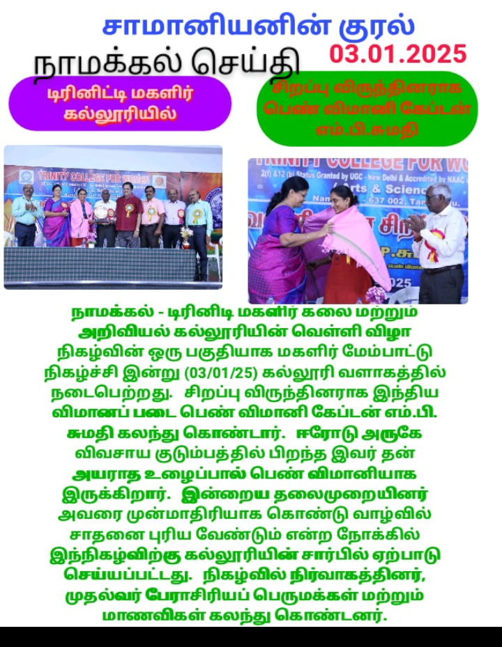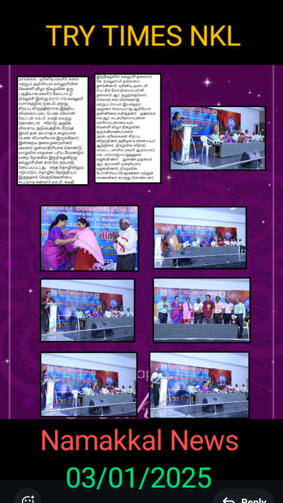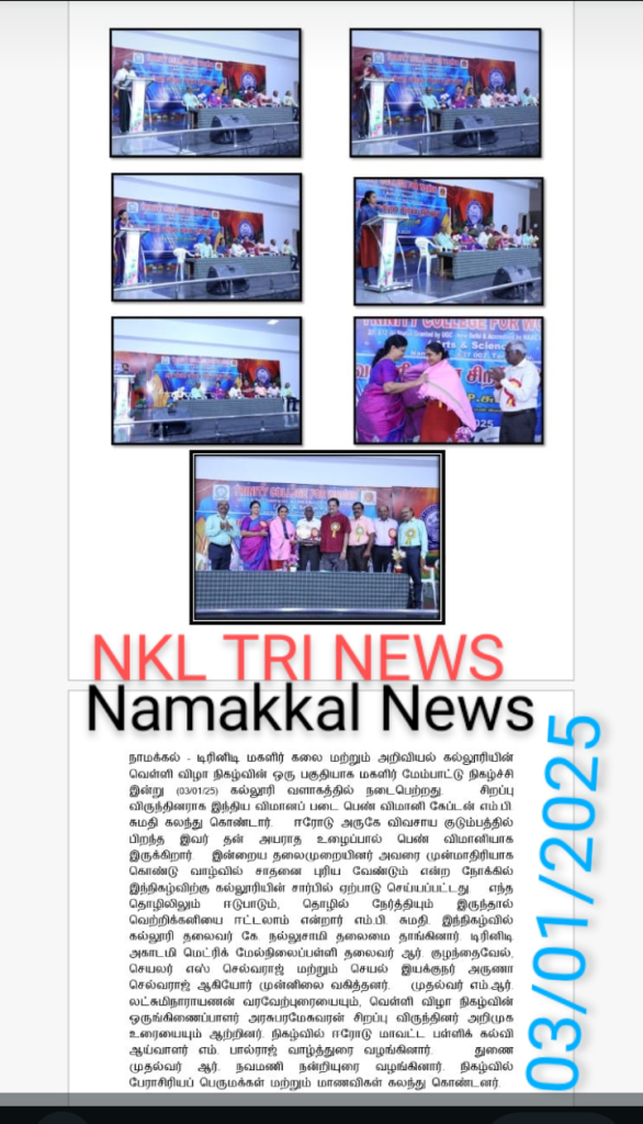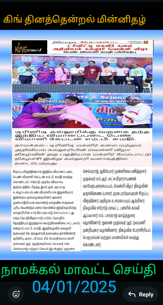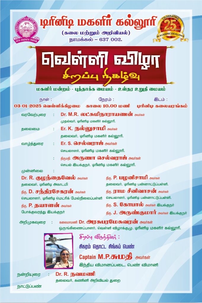 As part of the Silver Jubilee Celebrations, our Trinity College for Women, Namakkal, conducted a women’s empowerment programme entitled “Sky bound Aviatrix – An Outstanding Champion” on 03rd January 2025 (Friday) @ 10 AM in our Trinity Auditorium.
