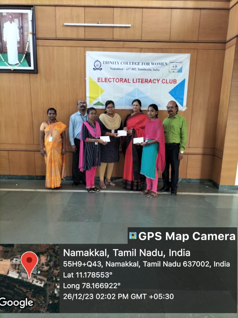 The above-mentioned prize winners and the participants are greeted on 26.12.2023 in the College campus. Mrs. Aruna Selvaraj, Executive Director, Trinity College for Women, Namakkal presided over the programme. Dr. M.R. Lakshiminarayanan, Principal and Dr. Arasuparameswaran, Director – Academic were also present on that occasion.