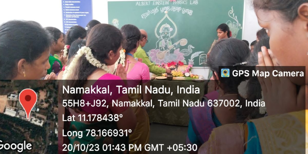 Ayutha Pooja was enthusiastically celebrated by the students and the faculty of Trinity College for Women, Namakkal, on October 20, 2023, in the college premises. All the laboratories, library, department staff rooms, classrooms, and floor were beautifully decorated with rangoli, banana trees, flower garlands, fruits, and flower postures.