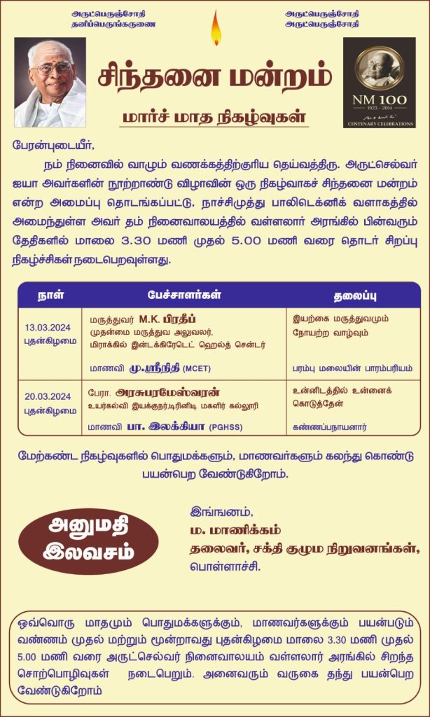 | 02 | 20.03.24 | Owing to the centenary birthday celebrations of Arutselvar Dr. N. Mahalingam, Thinkers Association, Pollachi conducted a special lecture programme on 13th and 14th March 2024 in the venue of Nachimuthu Polytechnic College, Pollachi, Coimbatore District. Dr.Arasuparameswaran, Director Academic, Trinity College for Women, Namakkal spoke titled “I gave myself to me” | Organized by Mr. M. Manickam, President, Sakthi Group of Companies, Pollachi. |