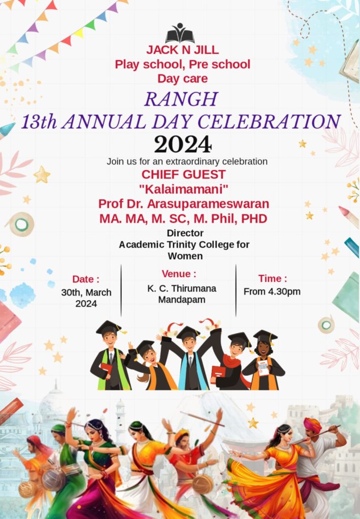 | 03 | 30.03.24 | Rangh 13th Annual Day Celebrations: He (Dr. Arasuparameswaran) acted as the chief guest. | Conducted by Jack N. Jill Play School, Preschool, and Day Care, held at the premises of “KC Marriage Hall,” Pappanaickenpudur, Coimbatore |