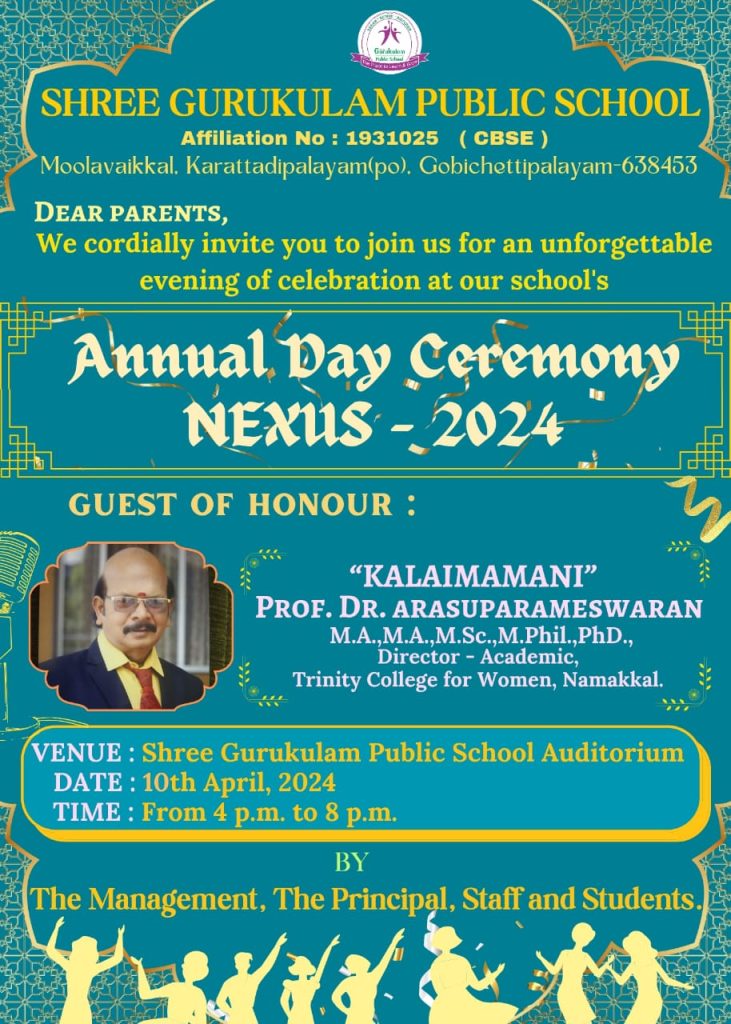 | 04 | 10.04.24 | Annual Day Ceremony: Nexus 2024. He (Dr.Arasuparameswaran) acted as the chief guest. | Shree Gurukulam Public School (CBSE), Moolavaikkal, Karattadipalayam, Gobichettipalayam, Erode Dt |