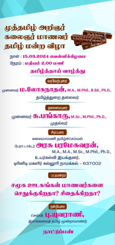 | 01 | 15.03.24 | Muthamizh Arignar Kalaignar Student’s Tamil Literary Association – He (Dr. Arasuparameswaran) acted as a debate judge entitled “If social website are carving or decaying the student’s community” | Naar Perum Vizhaa – Graduation Day, Sports Day, College Day and the programme on Muthamizh Arignar Kalaignar Student’s Tamil Literary Association – Bharat Rathna Puratchi Thalaivar Dr MGR Government Arts and Science College, Palacode, Dharmapuri District. |