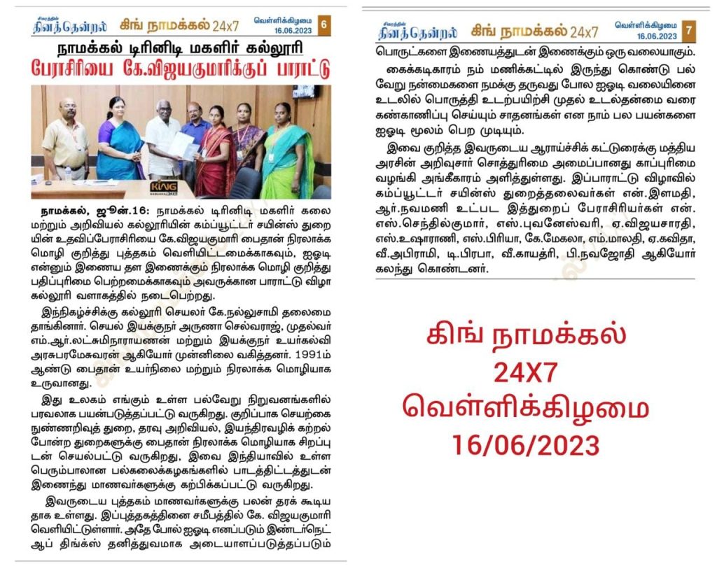 Er. K. Nallusamy, Secretary, Mrs. Aruna Selvaraj, Executive Director, Dr. M.R. Lakshiminarayanan, Principal, Dr. Arasuparameswaran, Director-Academic, the faculty members of Computer Science Dr. N. Elamathi, Mrs. R. Navamani, Mr. N.S. Senthilkumar, Mrs. S. Bhuvaneswari, Mrs. A. Vijayasarathi, Mrs. S. Usharani, Mrs. S. Priya, Mrs. K. Mekala, Mrs. M. Malathi, Mrs. A. Kavitha, Mrs. V. Abirami, Mrs. D. Prabha, Mrs. V. Gayathri and Mrs. P. Navajyothi have conveyed their greetings to Dr. K. Vijayakumari.