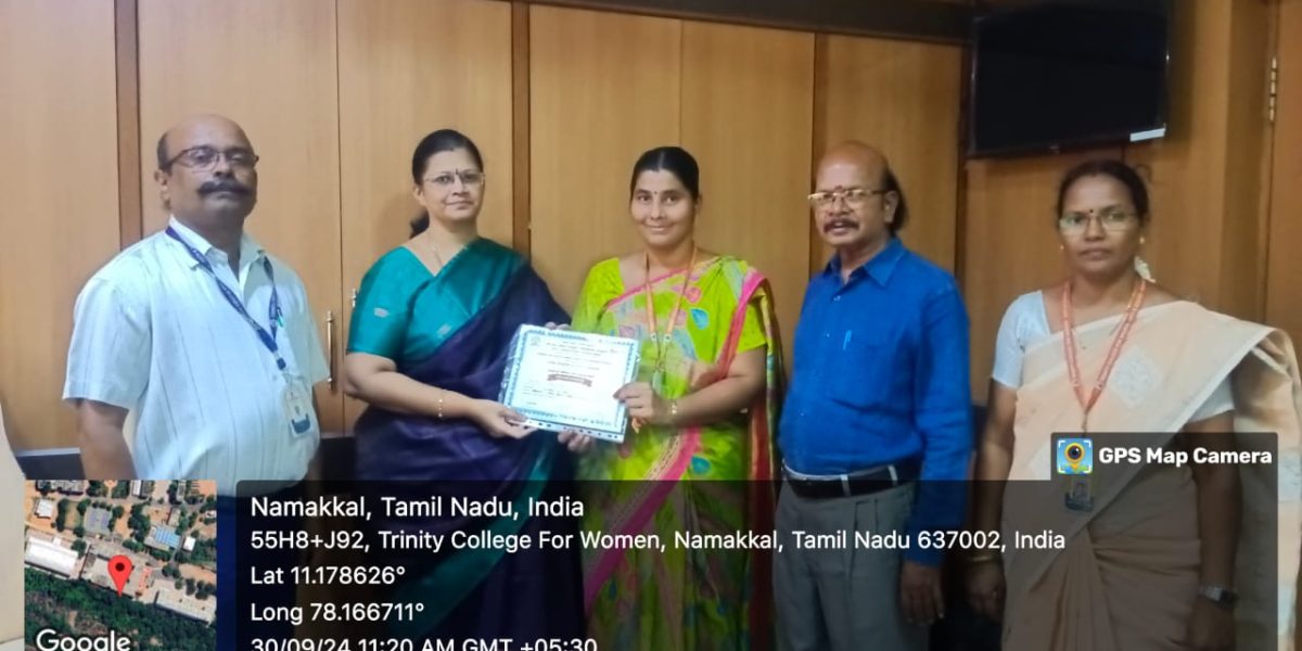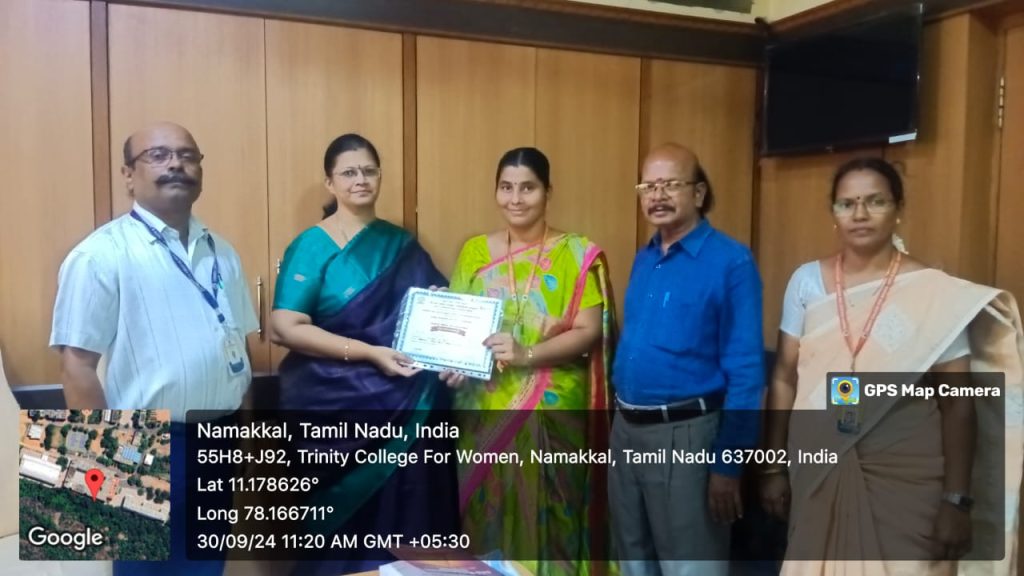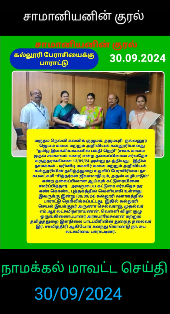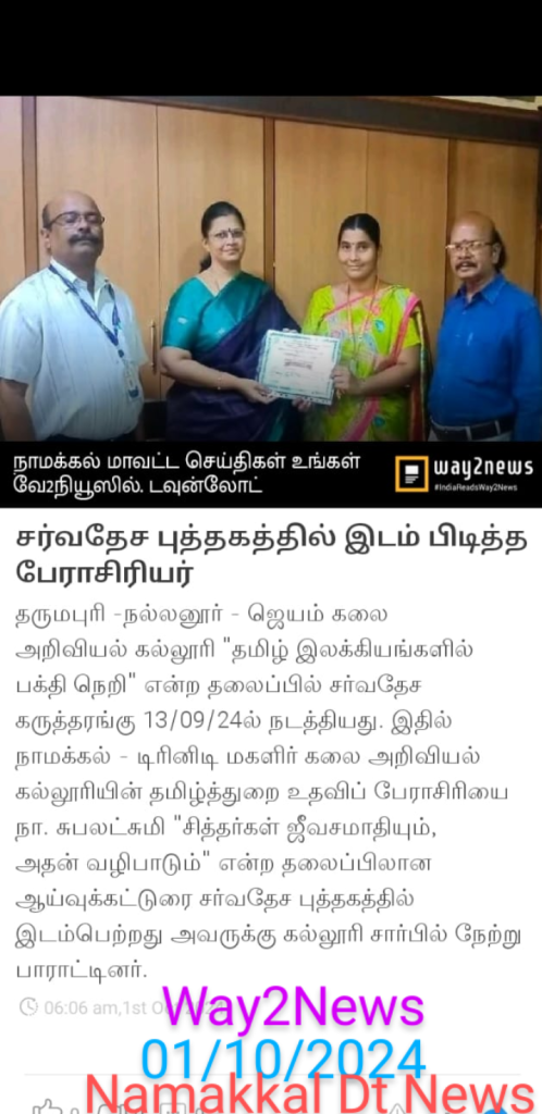 M/s. Marutham Nelli Educational Institutions, Jayam Arts and Science College, Nallanur, Dharmapuri organized a one day international conference titled “Devotational Path in Tamil Literature – From Sangam Period to Contemporary” தமிழ் இலக்கியங்களில் பக்தி நெறி (சங்க காலம் முதல் சமகாலம் வரை) on 13.09.2024 in the College campus. In this regard, many faculty members, research scholars and students from various colleges in and abroad took part. Dr. N. Subalakshmi, Assistant Professor in Tamil, Trinity College for Women, Namakkal participated and presented her research paper titled ”Sages – Martyrdom and its workshop” – (சித்தர்கள் ஜீவசமாதியும், அதன் வழிபாடும்) on that day.