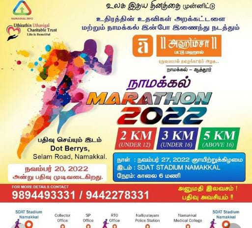 On account of World Heart Day, Uthirathin Uthavigal Charitable Trust, Namakkal and Namakkal Info in association with Ahimsa Pattu Mahal, Namakkal & Attur have organized an event in the title of “NAMAKKAL – MARATHON – 2022” on 27th November 2022 in the premises of Sports Development Authority of Tamil Nadu (SDAT Stadium), Namakkal. In this regard, more or less 500 athletes actively took part.