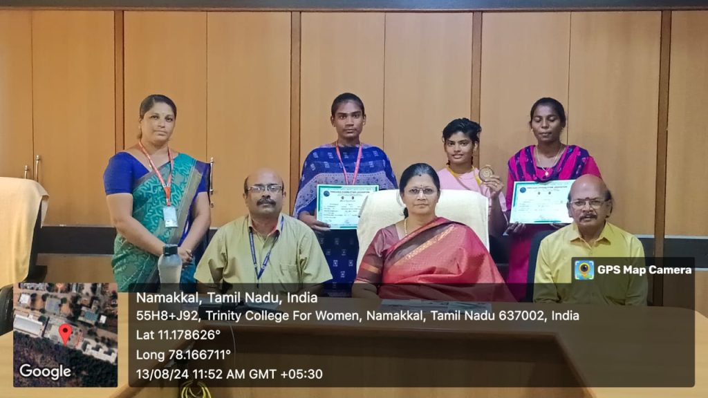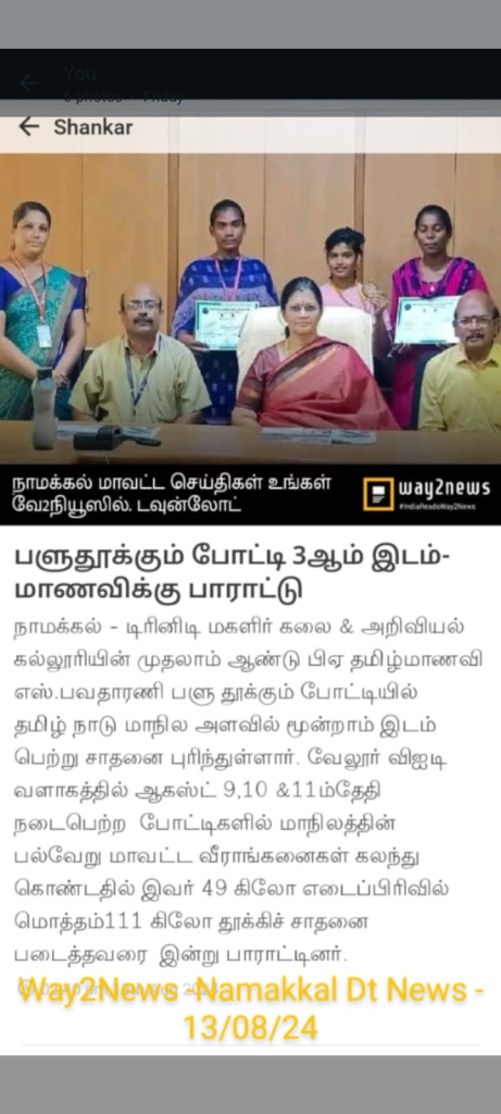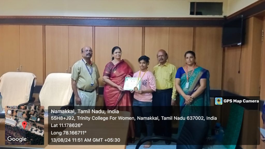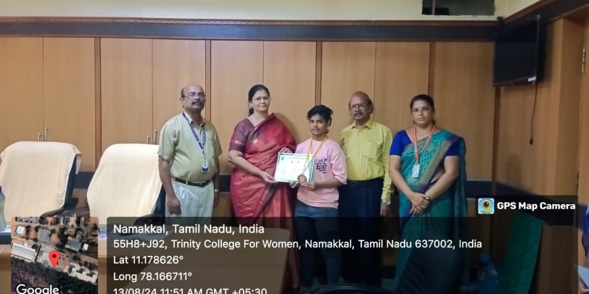 The Tamil Nadu Youth (Boys and Girls), Junior and Senior (Men and Women) weightlifting championship (2024-2025) was held from 09th August 2024 to 11th August 2024 in the venue of VIT University (Vellore Institute of Technology), Katpadi, Vellore. Many weightlifting players in and around Tamil Nadu state actively participated. Ms.S Bavadharani, first year B.A., Tamil of our College (Trinity College for Women, Namakkal), procured third place in the overall Tamil Nadu state. In continuation, a felicitation function was held on 13th August 2024 on the college campus. Mrs. Aruna Selvaraj, Executive Director, Dr. M.R. Lakshiminarayanan, Principal, Dr. Arasuparameswaran, Coordinator, Silver Jubilee Celebrations Committee, Mrs. V. Archana and Dr. R. Savithri, Assistant Professor and Head, Department of undergraduate Tamil conveyed their best wishes to Ms. S. Bavadharani for her achievement.