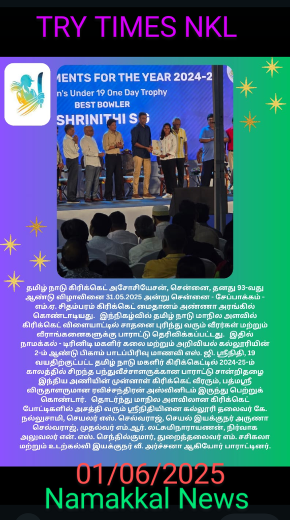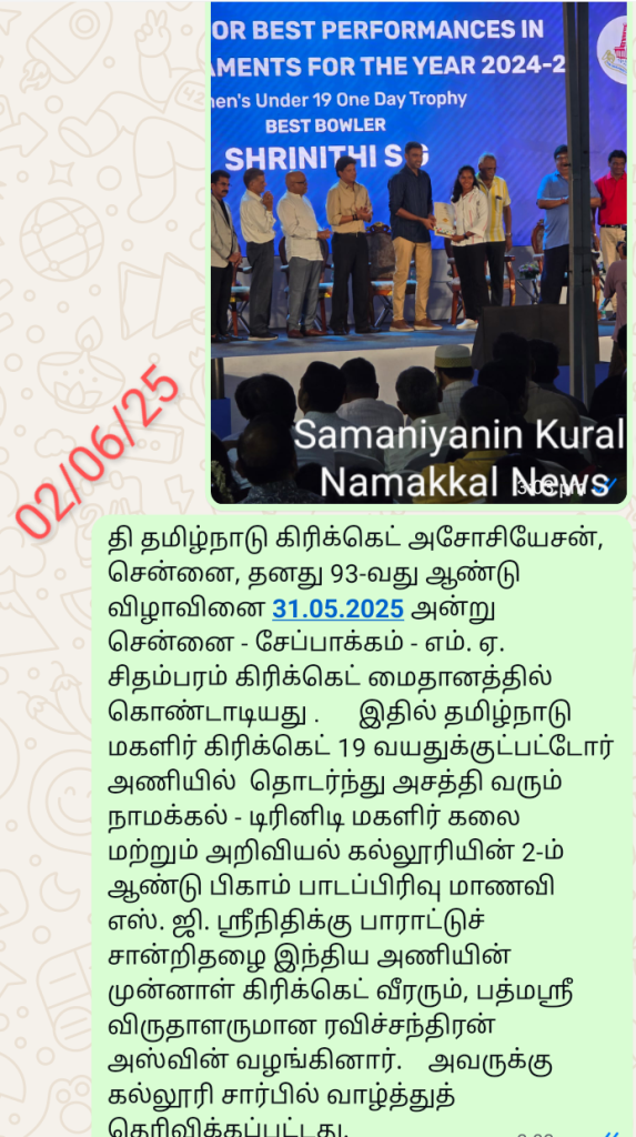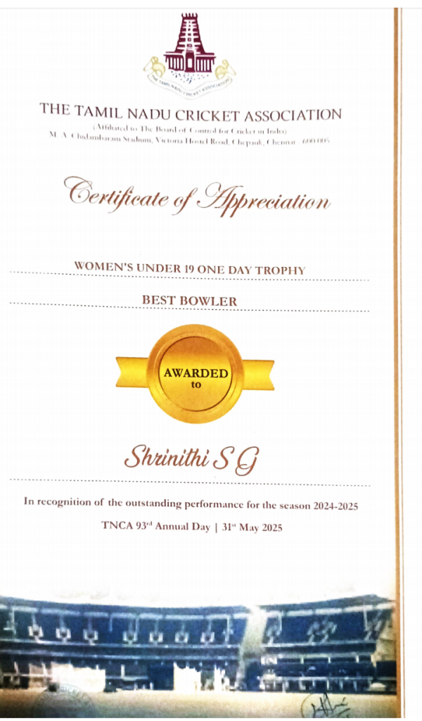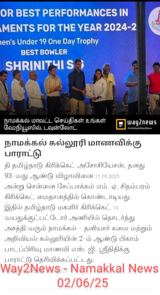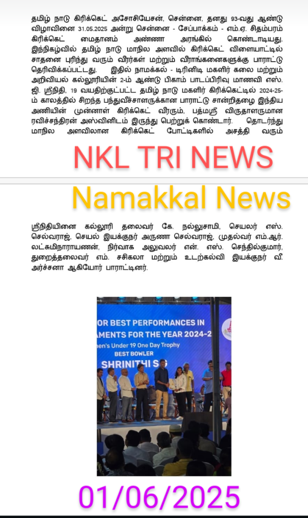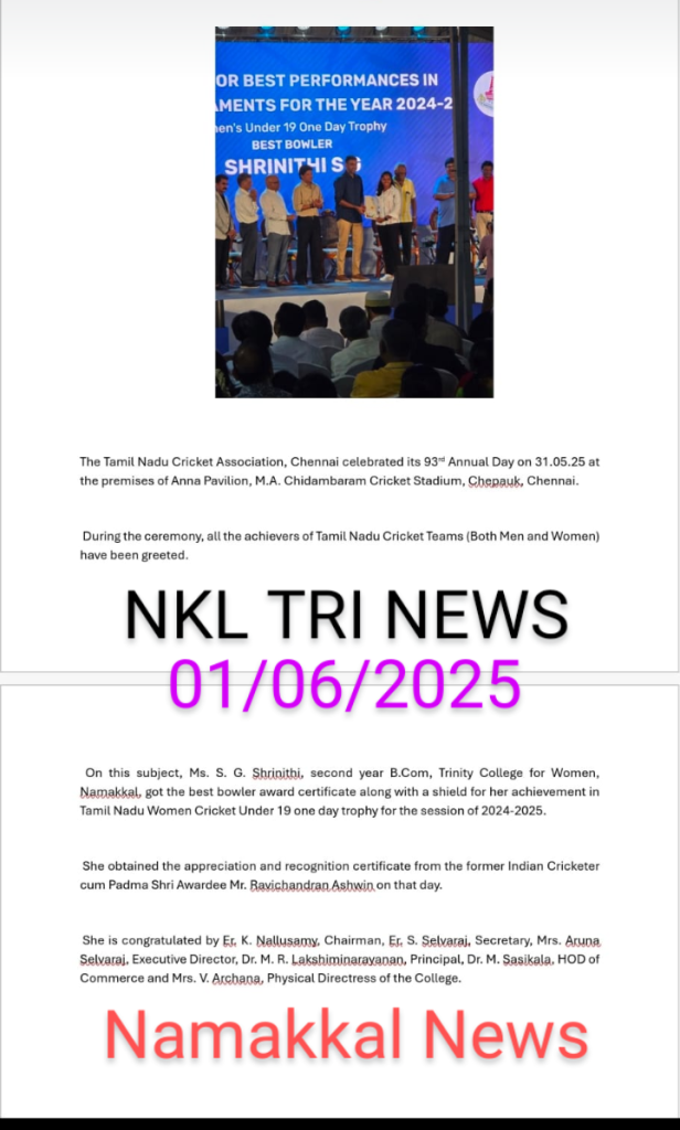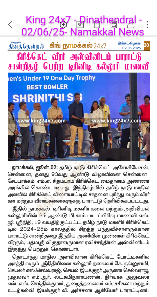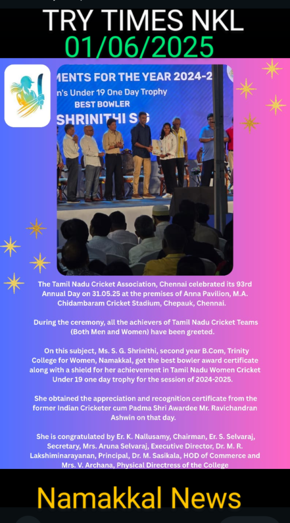On this subject, Ms. S.G. Shrinithi, second year B.Com., Trinity College for Women, Namakkal got the best bowler in women’s under 19 one day trophy for the session of 2024-2025.