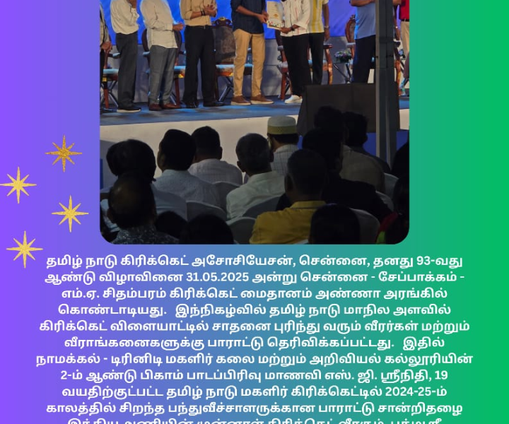 The Tamil Nadu Cricket Association, Chennai, celebrated its 93rd Annual Day on 31st May 2025 in Anna Pavilion, M.A. Chidambaram Stadium, Chepauk, Chennai.