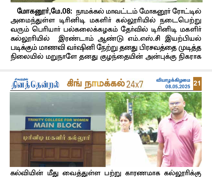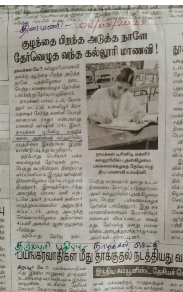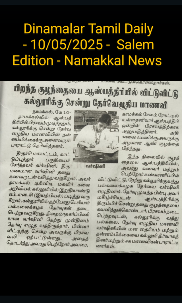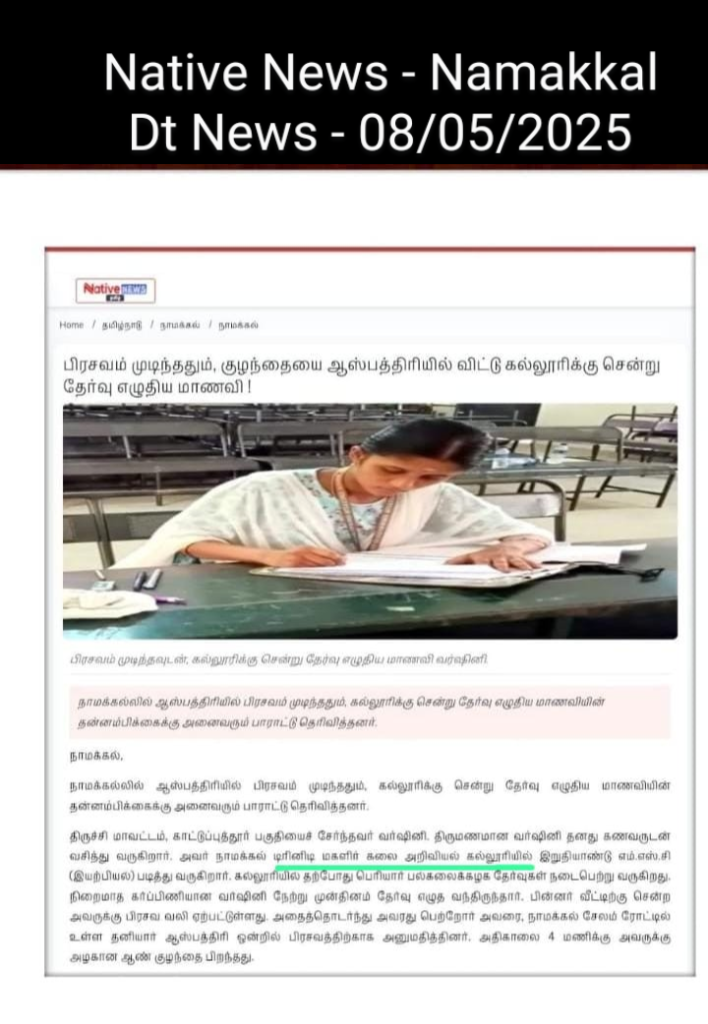 On 06th May 2025 (Tuesday), a male baby was born to her in the private hospital in Namakkal city. Her final fourth semester of Periyar University’s theoretical examination was held on the next day (07.05.2025) in the college center.