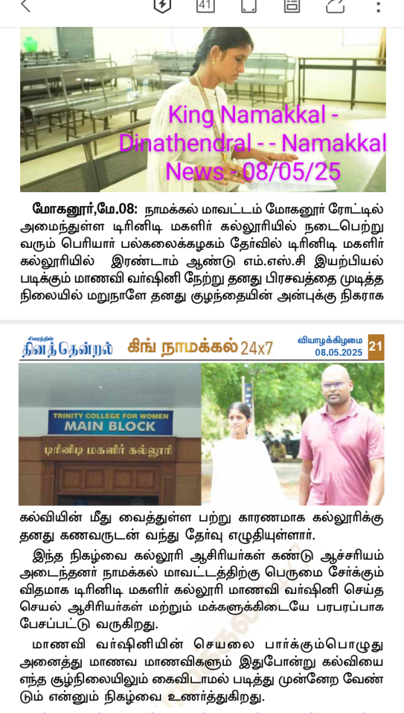 Even if her body is weakened and also mentally affected, she actively appeared in her examination boldly on Wednesday. On behalf of Trinity College for Women, Namakkal, the management, the Principal, the various department heads, faculty members and the students have conveyed their best wishes to Mrs. V. Varshini for her ardour.