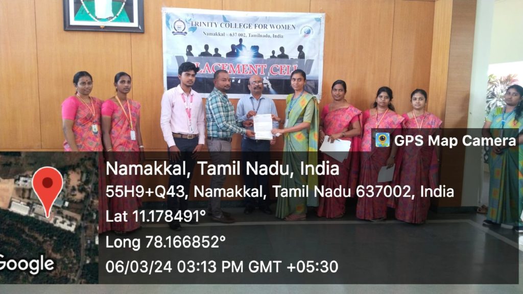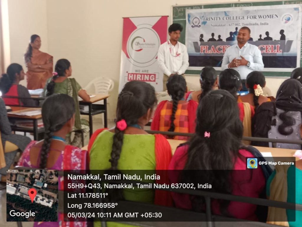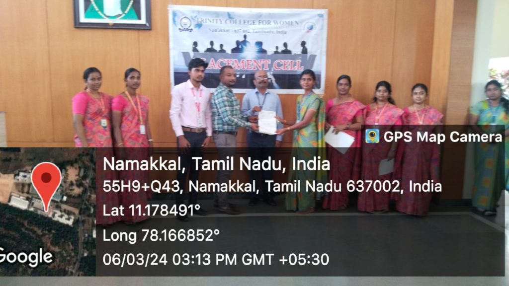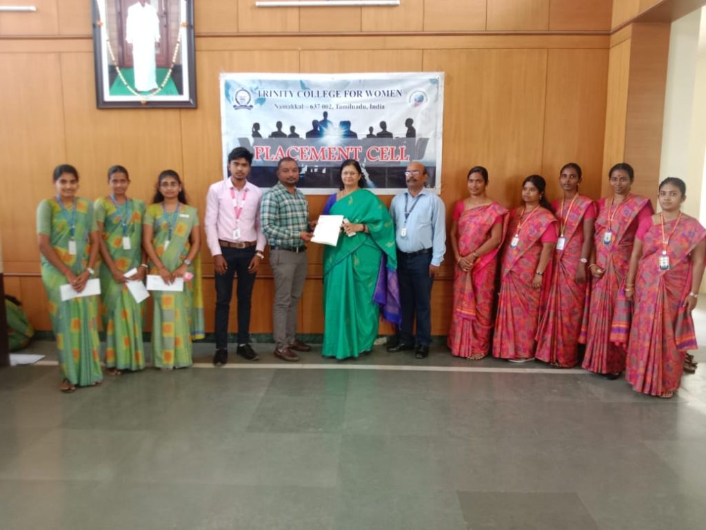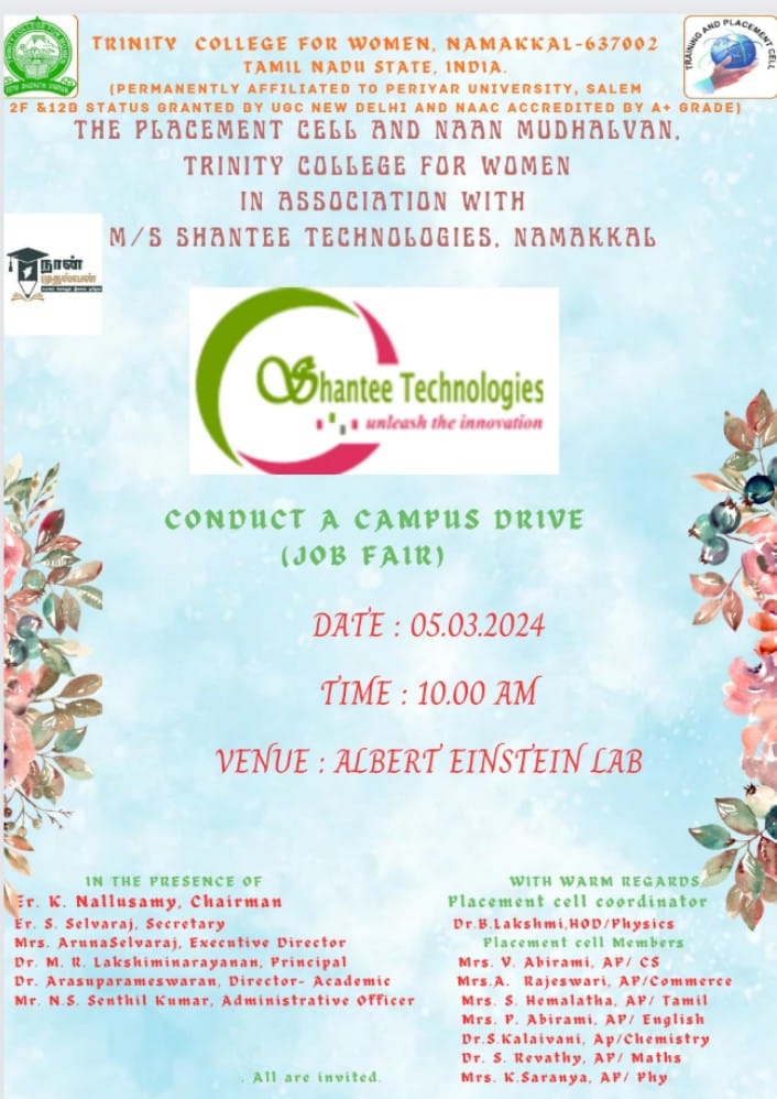 The Placement Cell and Naan Mudhalvan, Trinity College for Women, Namakkal, in support of M/s. Shantinee Technologies, Namakkal jointly conducted “a campus drive” (a job fair) on March 5, 2024, in the Albert Einstein Laboratory, Department of Physics of the College. Mr. Chandrasekar Ponnambalam, Founder and Managing Director, and Mr. M. Kishore Kumar, HR Executive, Shantee Technologies, Namakkal, conducted the interview and selected the candidates through a written test, group discussion, and personal interview. More or less, 100 students have taken part. Finally, the following 15 final-year students of B.Sc. Computer Science have been selected for the post of BPO (Business Process Outsourcing).