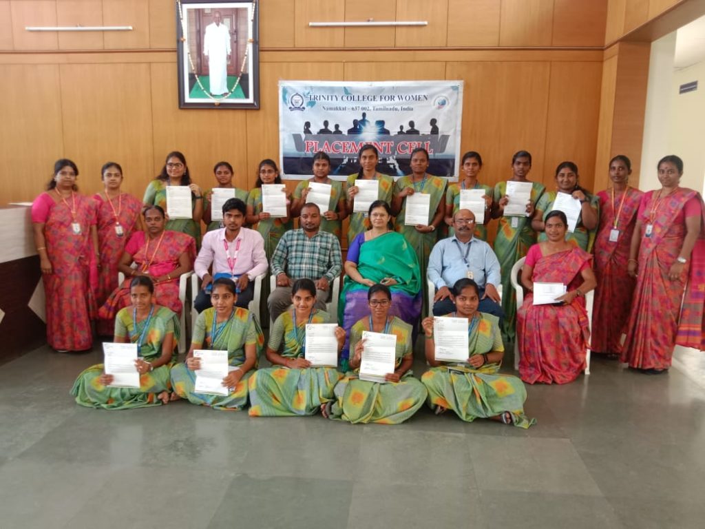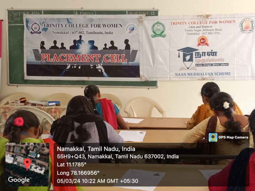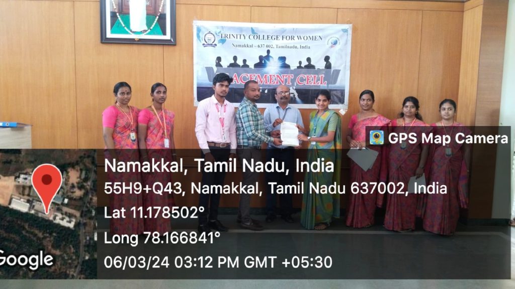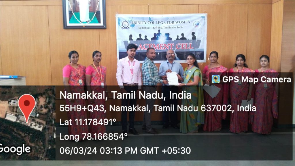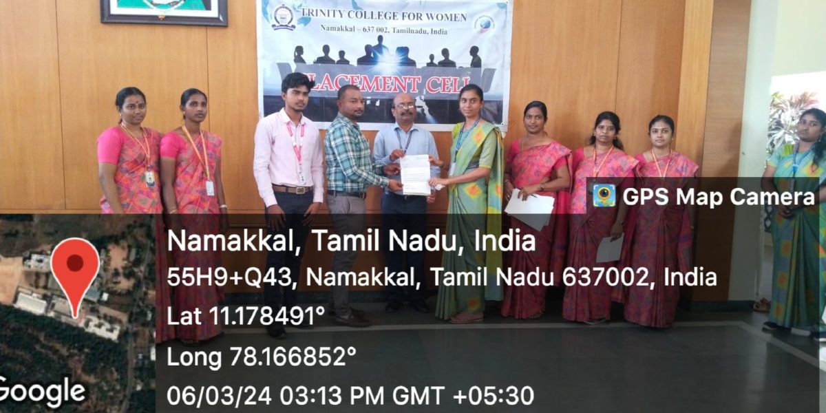 The Placement Cell and Naan Mudhalvan, Trinity College for Women, Namakkal, in support of M/s. Shantinee Technologies, Namakkal jointly conducted “a campus drive” (a job fair) on March 5, 2024, in the Albert Einstein Laboratory, Department of Physics of the College. Mr. Chandrasekar Ponnambalam, Founder and Managing Director, and Mr. M. Kishore Kumar, HR Executive, Shantee Technologies, Namakkal, conducted the interview and selected the candidates through a written test, group discussion, and personal interview. More or less, 100 students have taken part. Finally, the following 15 final-year students of B.Sc. Computer Science have been selected for the post of BPO (Business Process Outsourcing).