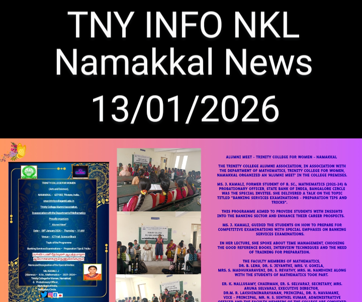 Read MoreAlumni Meet The Trinity College Alumni Association, in association with the Department of Mathematics, Trinity College for Women, Namakkal, organized an “Alumni Meet” on 08.01.2026 in the College premises. Ms. J. Kamali, Alumnus – B.Sc., Mathematics (2021-2024), Trinity College for Women, Namakkal and Probationary Officer, State Bank of India, Bengaluru Circle was the special invitee. […]
