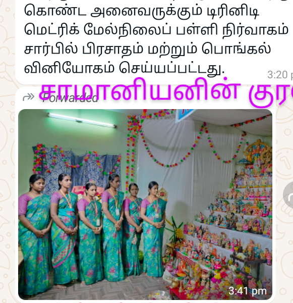Read MoreKolu celebrations Kolu was celebrated at Trinity Matriculation Higher Secondary School, Trinity Nagar, Mohanur Road, Namakkal, with pomp and gaiety from 3rd October 2024 onwards. Dolls were arranged as per the tradition and religious faith and they sang hymns and recited slogans in praise of goddess Saraswathi, Lakshmi and Durga. During the nine – day festival, the school […]