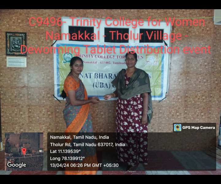 Read MoreDistribution of deworming tablets Under the UBA Cell (C9496), Trinity College for Women, Namakkal arranged a program titled “Supply of Deworming Tablets” (Albendazole) to the public of Tholur village, Mohanur Block, Namakkal district. This program was started in Keezh Tholur village on 13th April 2024. Mrs. D. Prabha, Assistant Professor in Computer Science and UBA Cell […]