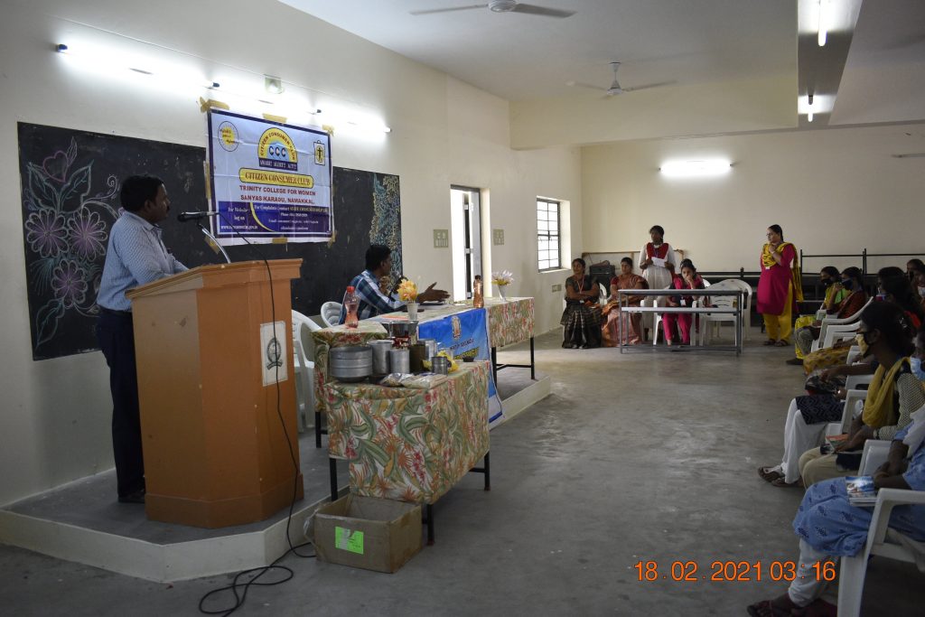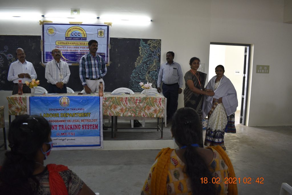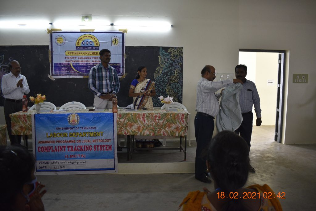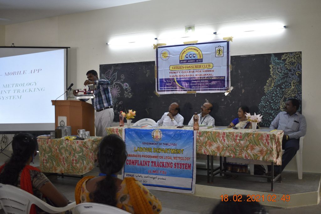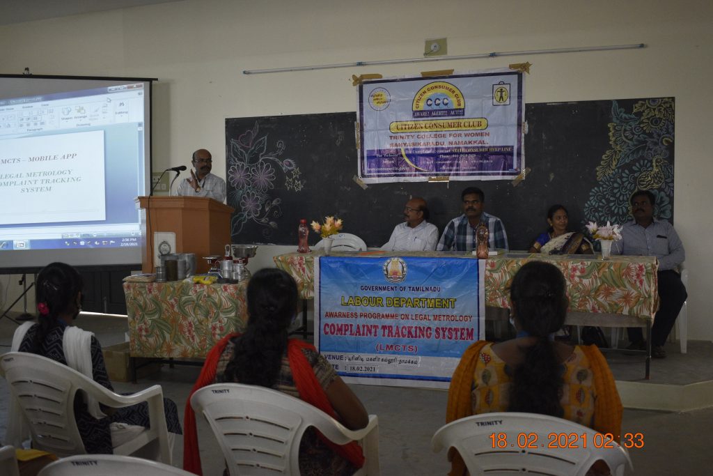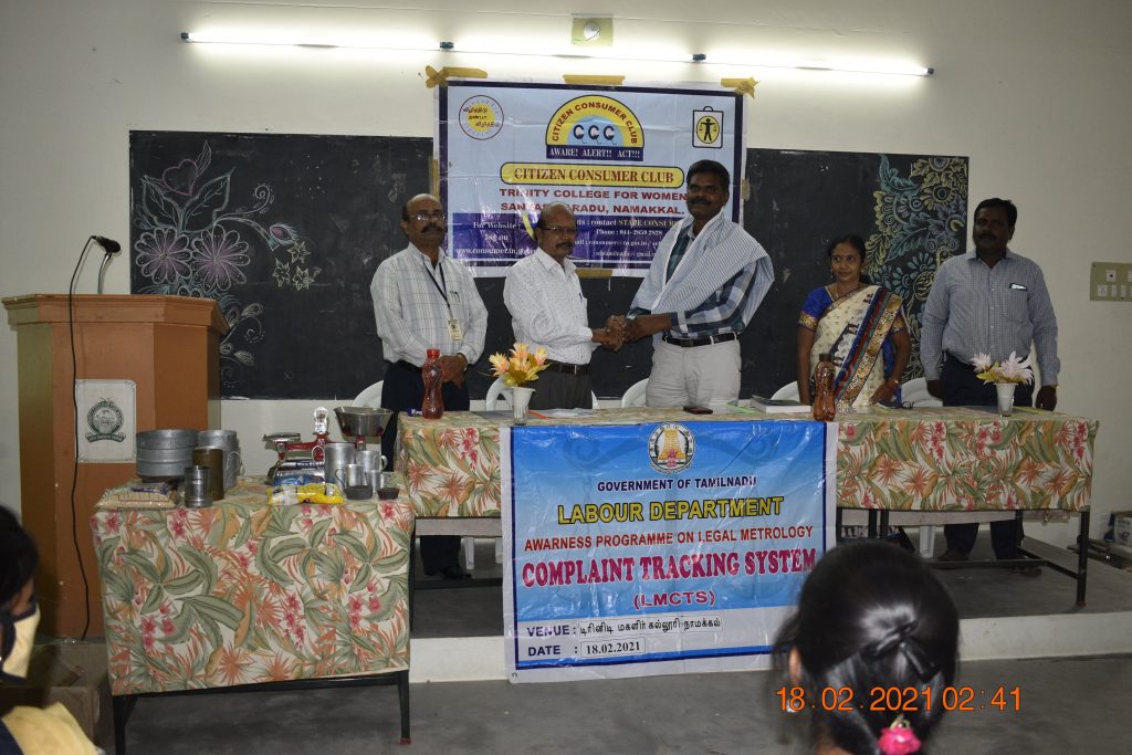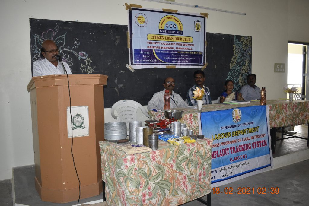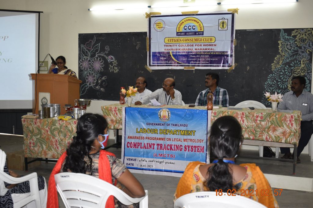 · The Department of Labour – Legal Metrology, Namakkal District and Citizen Consumer Club, Trinity College for Women, Namakkal jointly conducted a one day awareness programme on 18th February 2021 @ 3 pm. The title of the awareness programme was “Legal Metrology” (“சட்டமுறை எடை அளவுகள்“ என்ற தலைப்பிலான விழிப்புணர்வு நிகழ்வு)