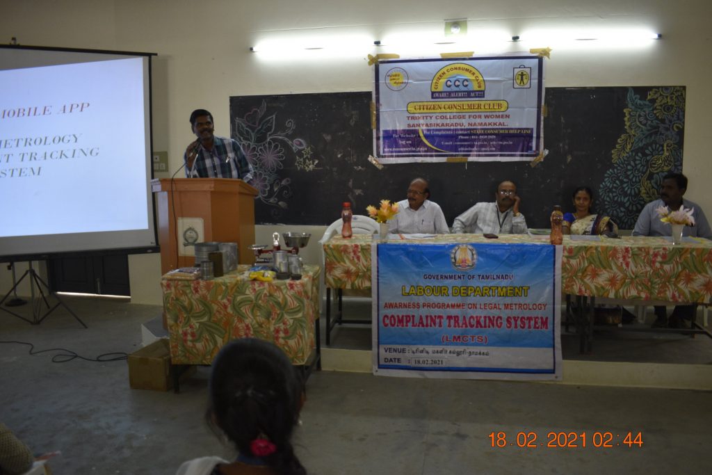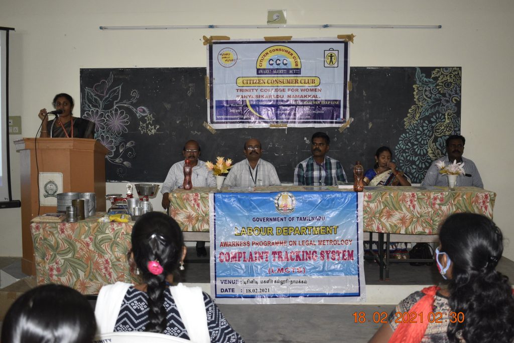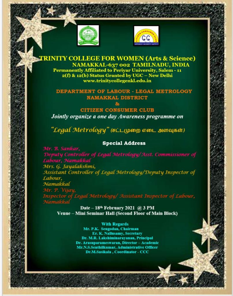 · Awareness Programme on Legal Metrology The Department of Labour – Legal Metrology, Namakkal District and Citizen Consumer Club, Trinity College for Women, Namakkal jointly conducted a one day awareness programme on 18th February 2021 @ 3 pm. The title of the awareness programme was “Legal Metrology” (“சட்டமுறை எடை அளவுகள்“ என்ற தலைப்பிலான விழிப்புணர்வு நிகழ்வு)